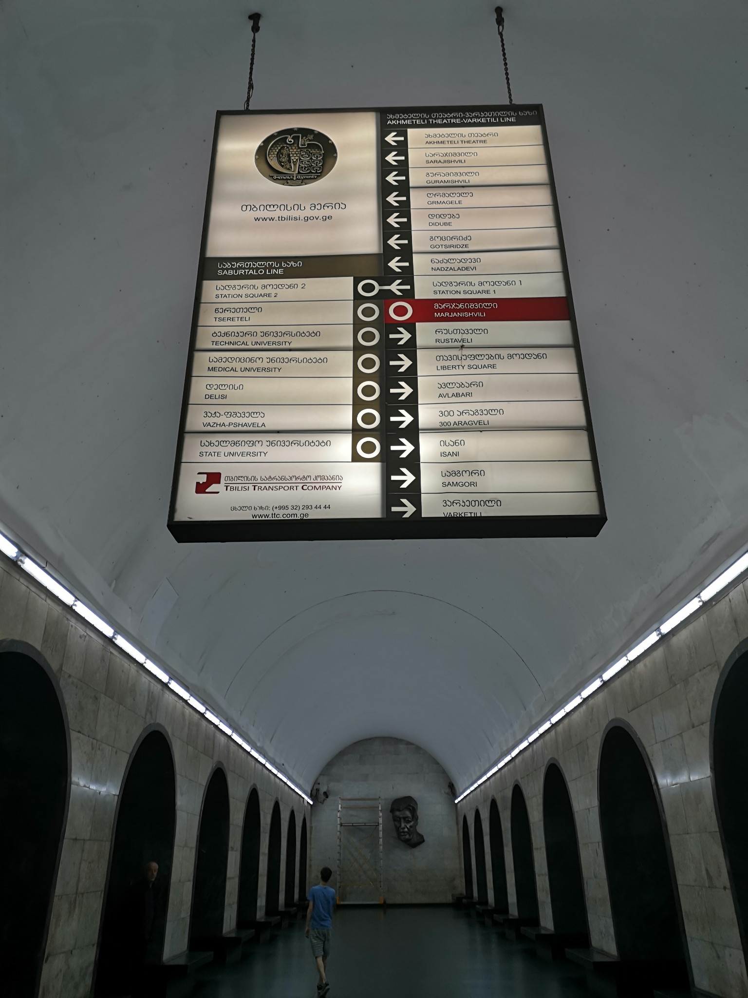 第比利斯地铁就两条,在火车站可以换乘。一张卡人工费是2拉里,如果要退可以凭借缴费的小单子退钱。进站处有窗口可以办理以及充值,一张卡可以由多人使用,一次0.5拉里。扶梯非常深,而且速度非常快,坐地铁的人也忒别多,像进了防空洞似的。酒店出发坐地铁在Didube站出站,这里有市内黄色公交、市际白色小巴、包车,其他攻略上有说去姆茨赫塔可以坐小巴1拉里,不过我们没找到,包车来回。