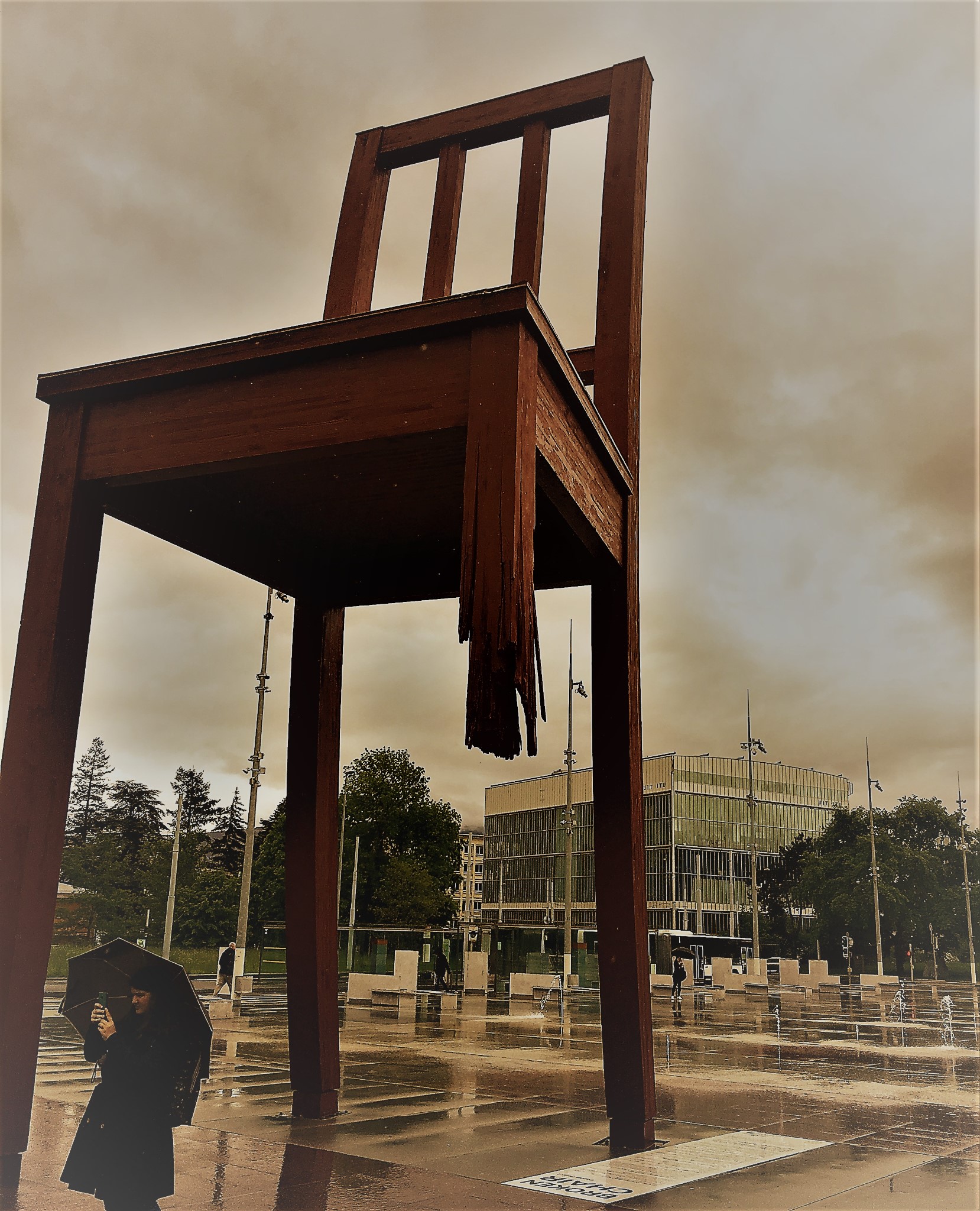 断腿的椅子是联合国广场的雕塑,为了纪念那些战争中被地雷炸伤的苦难的人,不要战争要和平。雕塑非常震撼,效果很好。