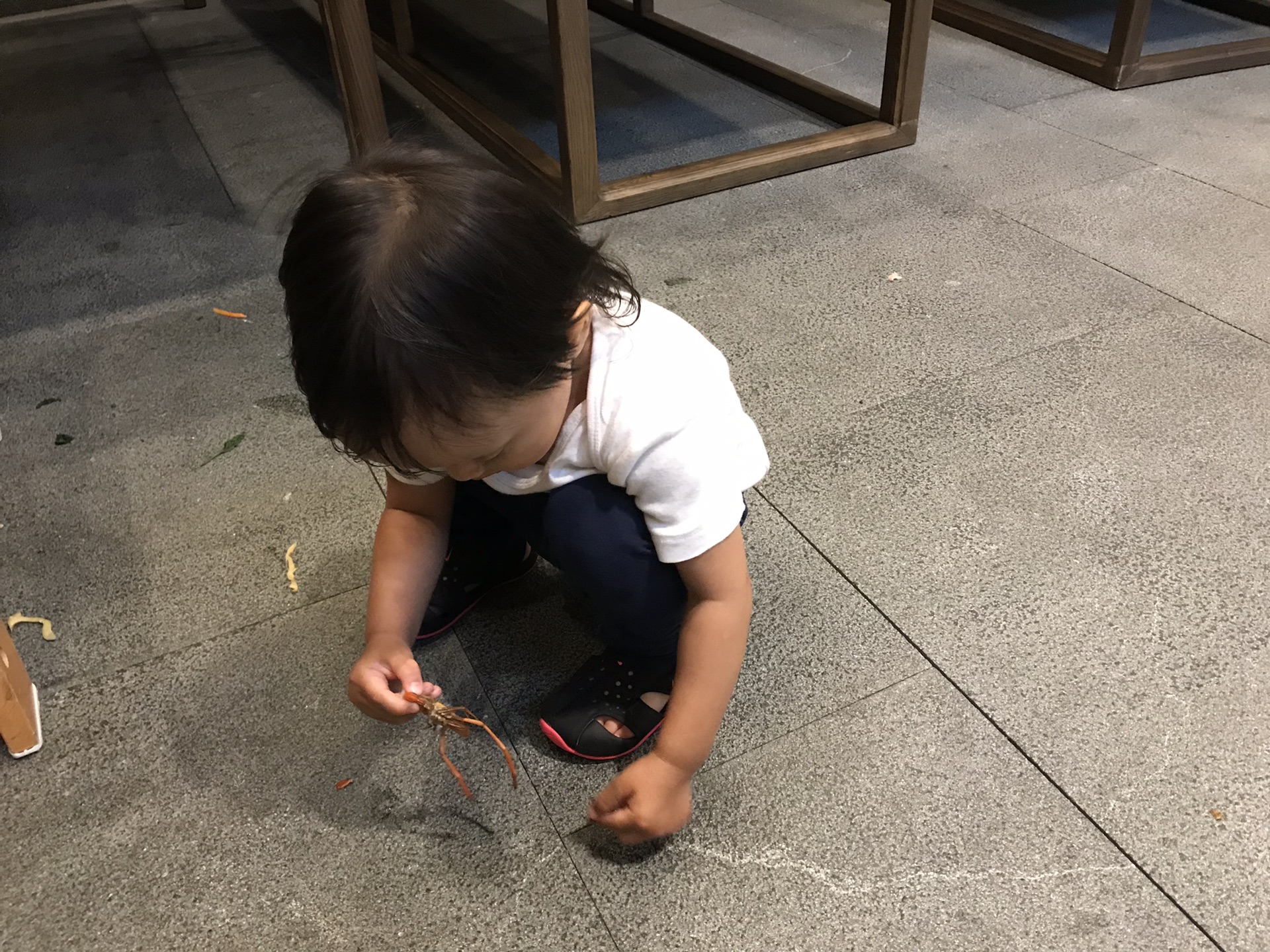 安仔小朋友被汤里面的小河虾吸引出来,摆弄得无法自拔。