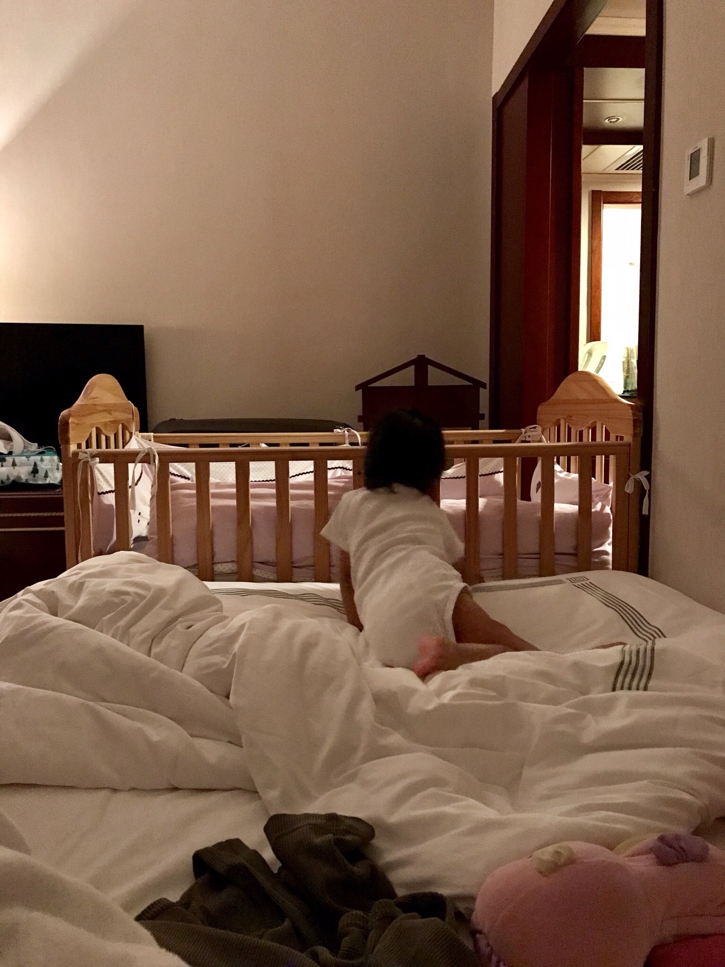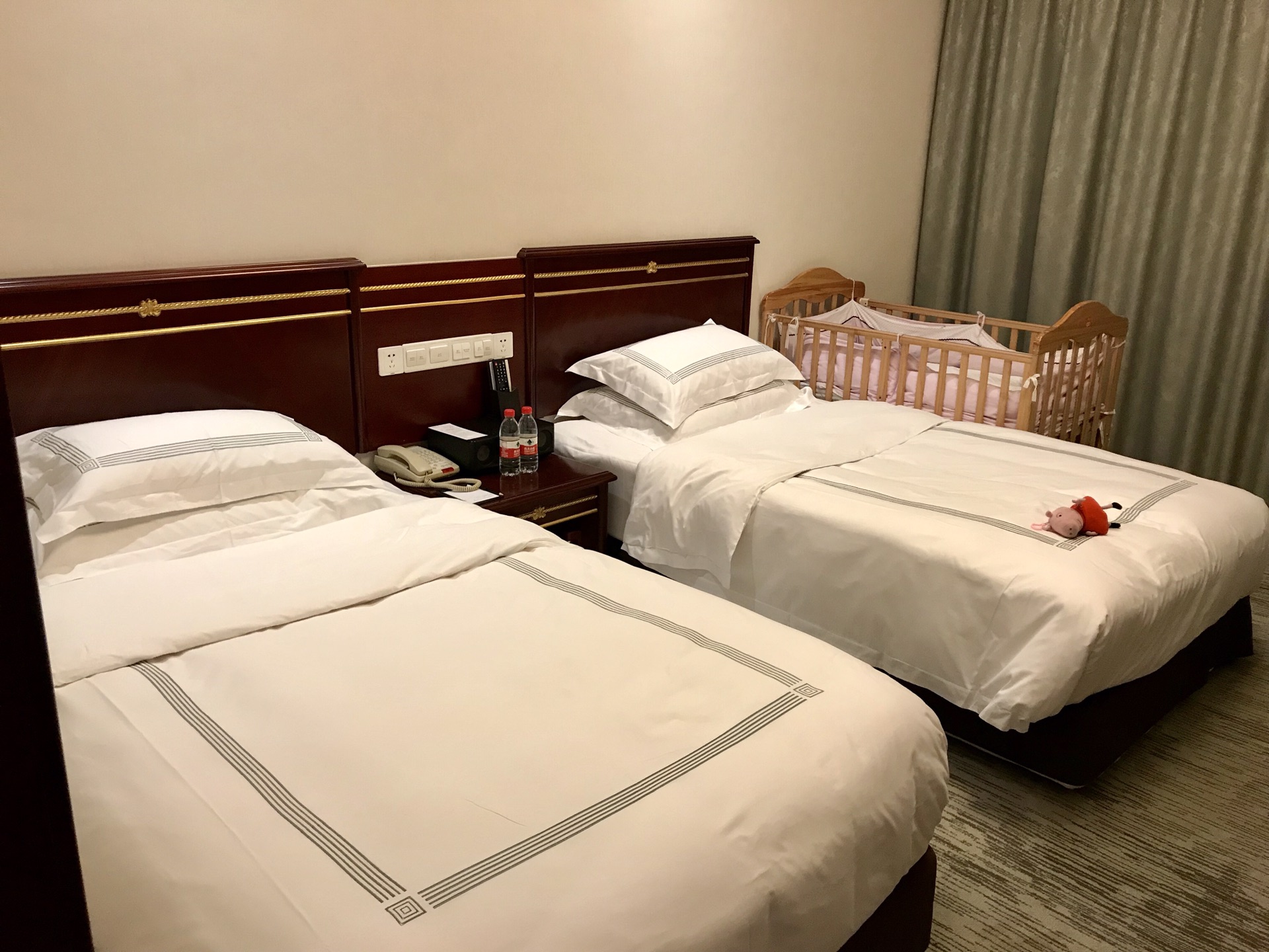 回房间喽,虽然是6号楼(评论里最老旧的一栋),不过我还是可以接受的。之前还以为可以免费升级一下,可没想到端午来杭州的人真不少。酒店给我们提供了免费的婴儿床,安仔小朋友肯定是不会睡的,我们就直接用用来当窗围子了。