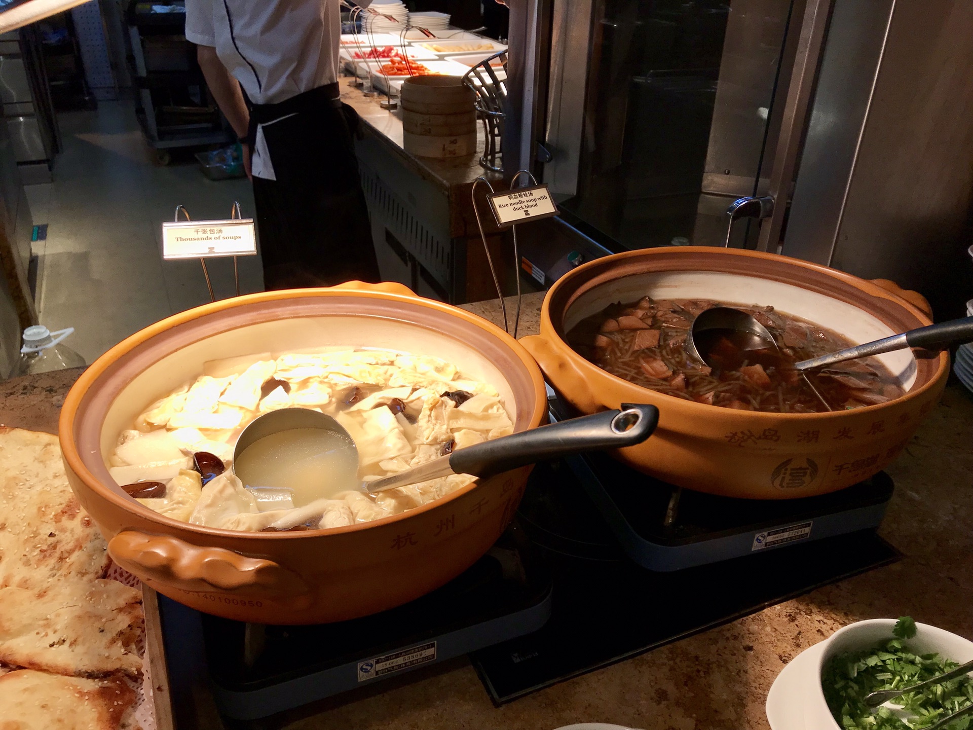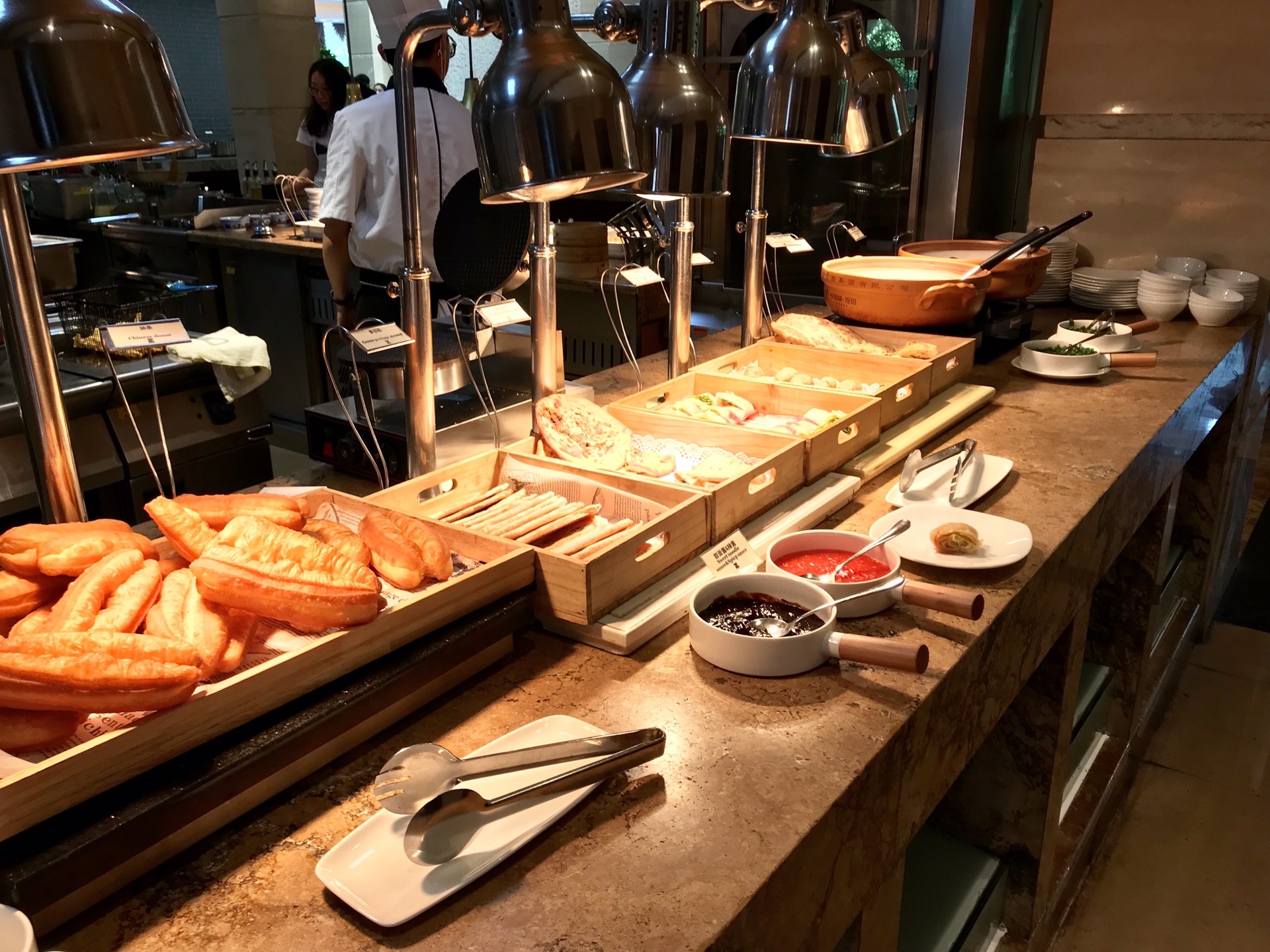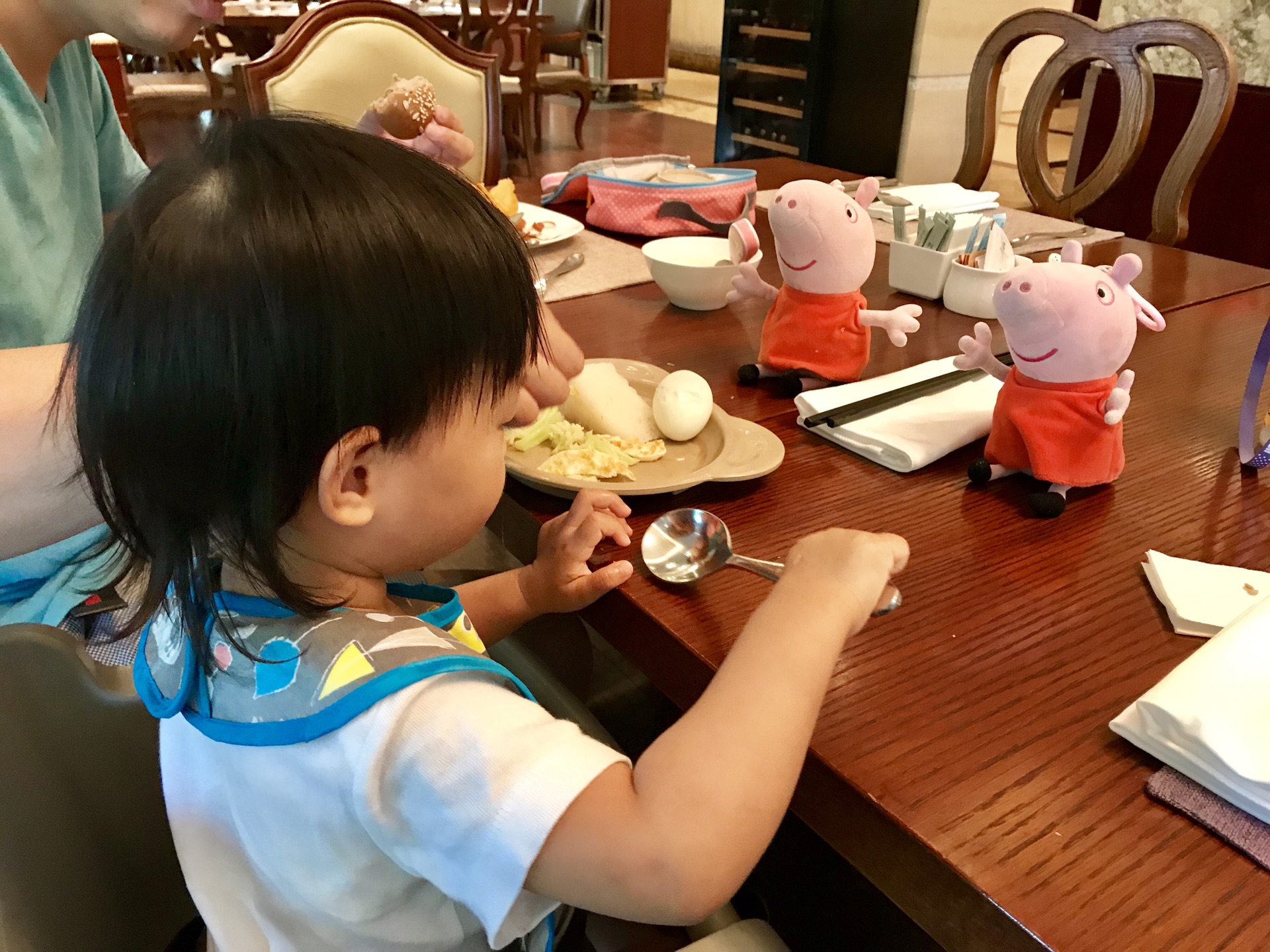 经过第一天的奔波,大家除安仔外都起得好晚。去吃早饭喽~安仔小朋友带上了自己心爱的佩琦和佩琦,一起去吃早饭。自助早餐种类不多但居然有我喜欢的鸭血粉丝汤。