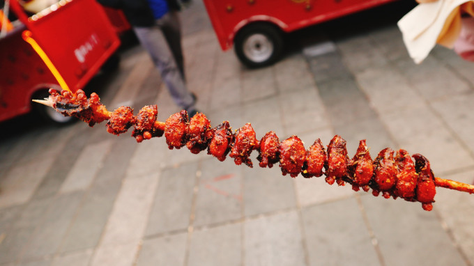 这条街上比较特色的是牛羊串,有2种方式,一种是炸的,一种是烤的