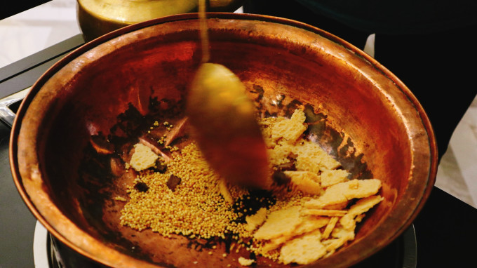 锅茶是用炒米、牛肉干、奶皮子、酥油等食材放入锅中,用大勺子反复炒制,然后把煮好的奶茶倒进铜锅里,等待片烧开之后即可饮用。