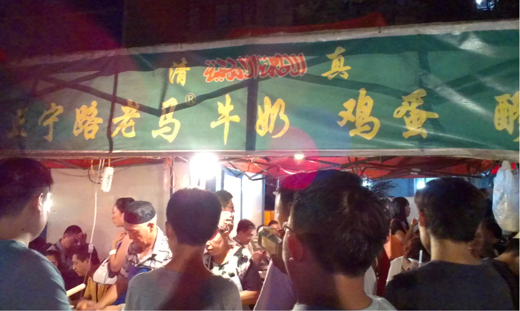 正宁路夜市:老马家的牛奶鸡蛋醪糟:9元一碗,排队很久。需要注意的是从夜市门口进来不远,还有一家德林家牛奶鸡蛋醪糟排队的人也很多,并且招牌上写着舌尖上的中国推荐。专门买老马家的亲们注意别排错了。