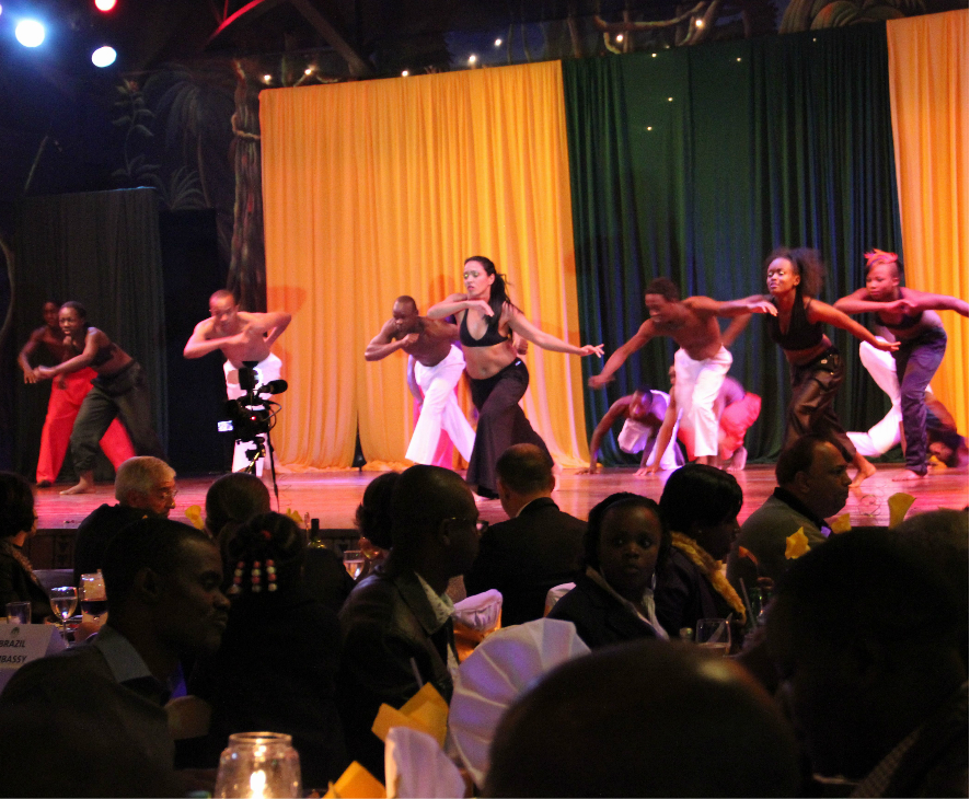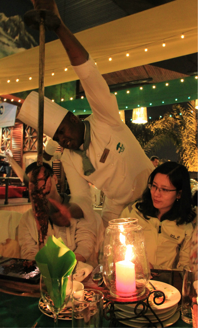 晚上,地导安排我们到Tamanbo Bar and Grill歺厅一边吃烤肉大餐,一边欣赏肯尼亚热情奔放的歌舞。原生态、无污染的烤肉大餐十分丰富,有牛肉、羊肉、火鸡肉、野猪肉、羚羊肉、鸵鸟肉等。