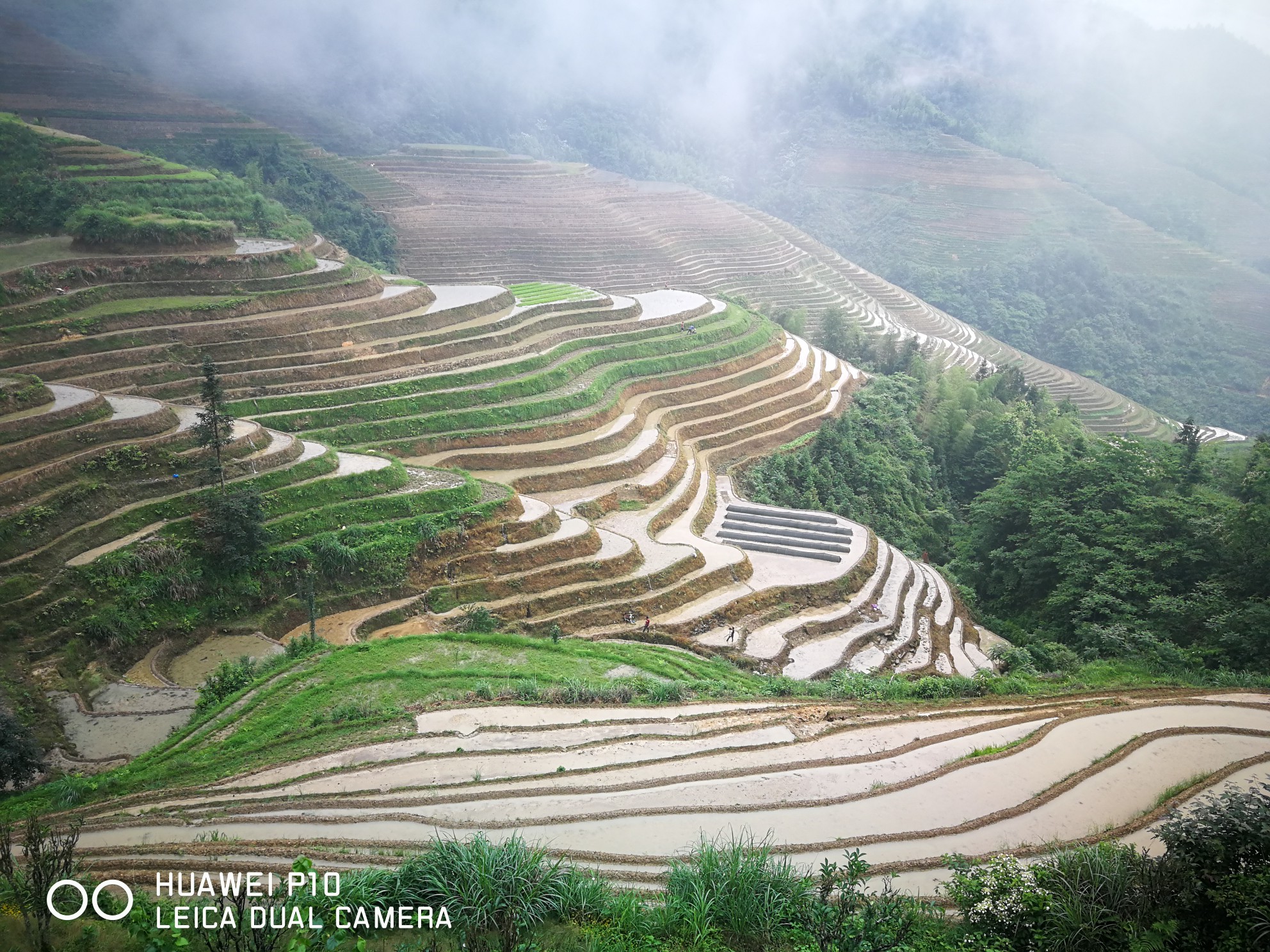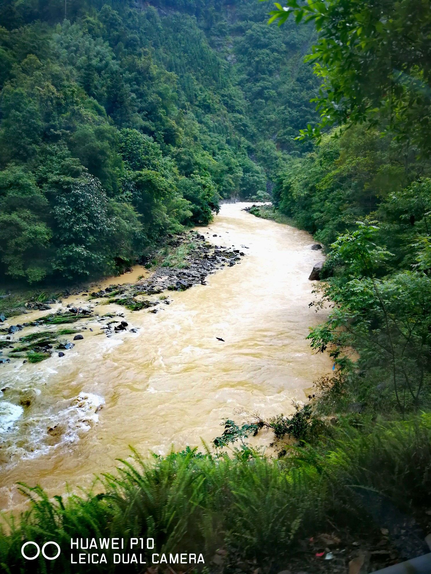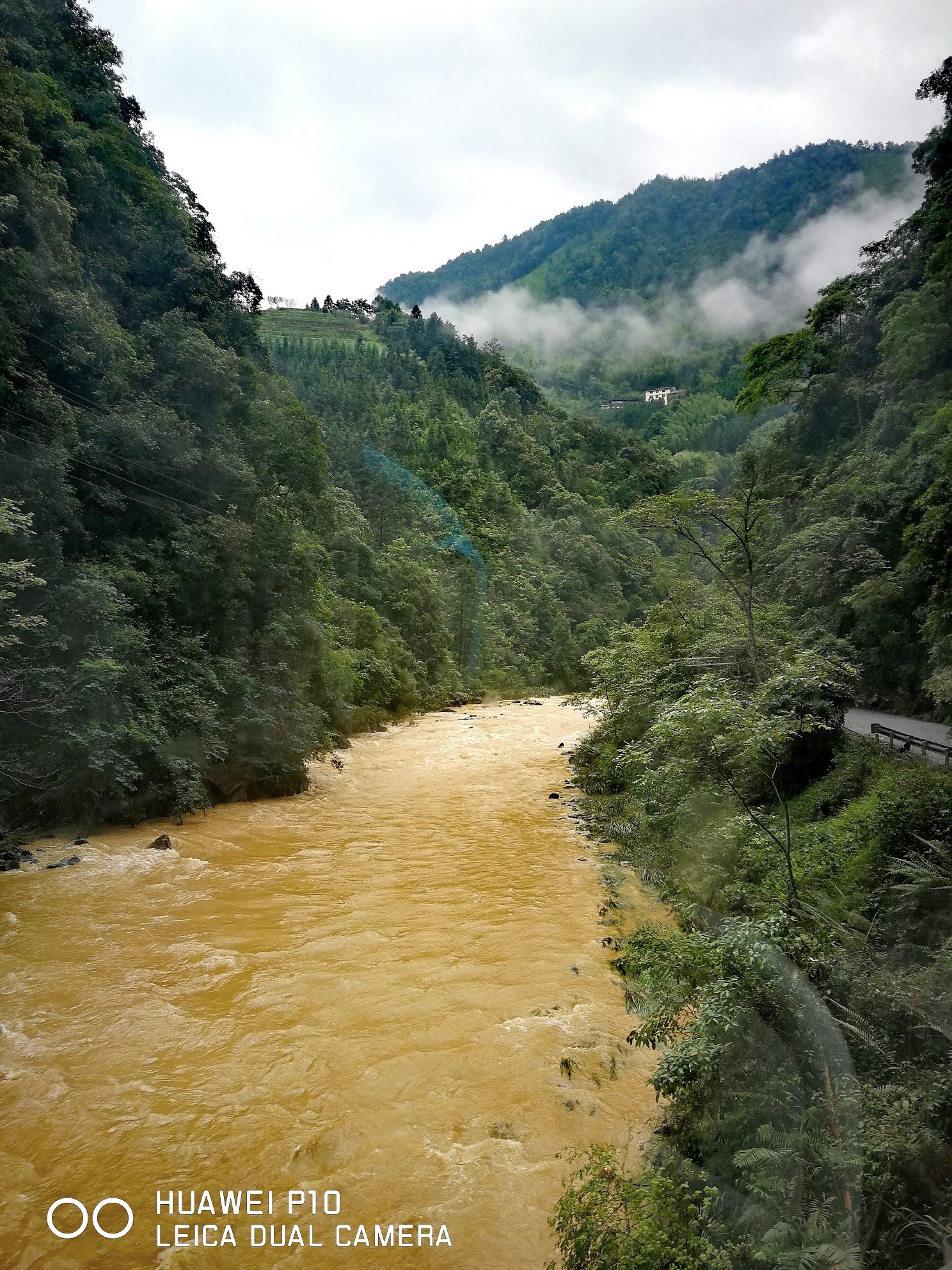 我们早上8点从桂林市区出发,离龙脊梯田景区还有30公里的时候车就开始上山了,车沿着峡谷往山上盘延着。从山上留下湍急的河水翻滚着发出轰鸣的吼声,河水特别的黄,问过司机才知道昨天下了一场大暴雨,河水中有大量的泥沙,平时河水是清澈见底的。由于路基冲坏了好几处造成断路,昨天好多车被迫堵在路上等待抢修,直到我们去的上午都还在抢修,不过我们还算幸运顺利通过没有堵在路上。