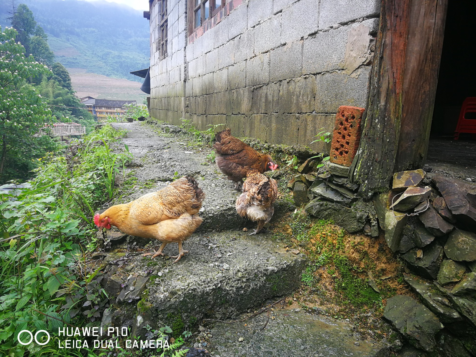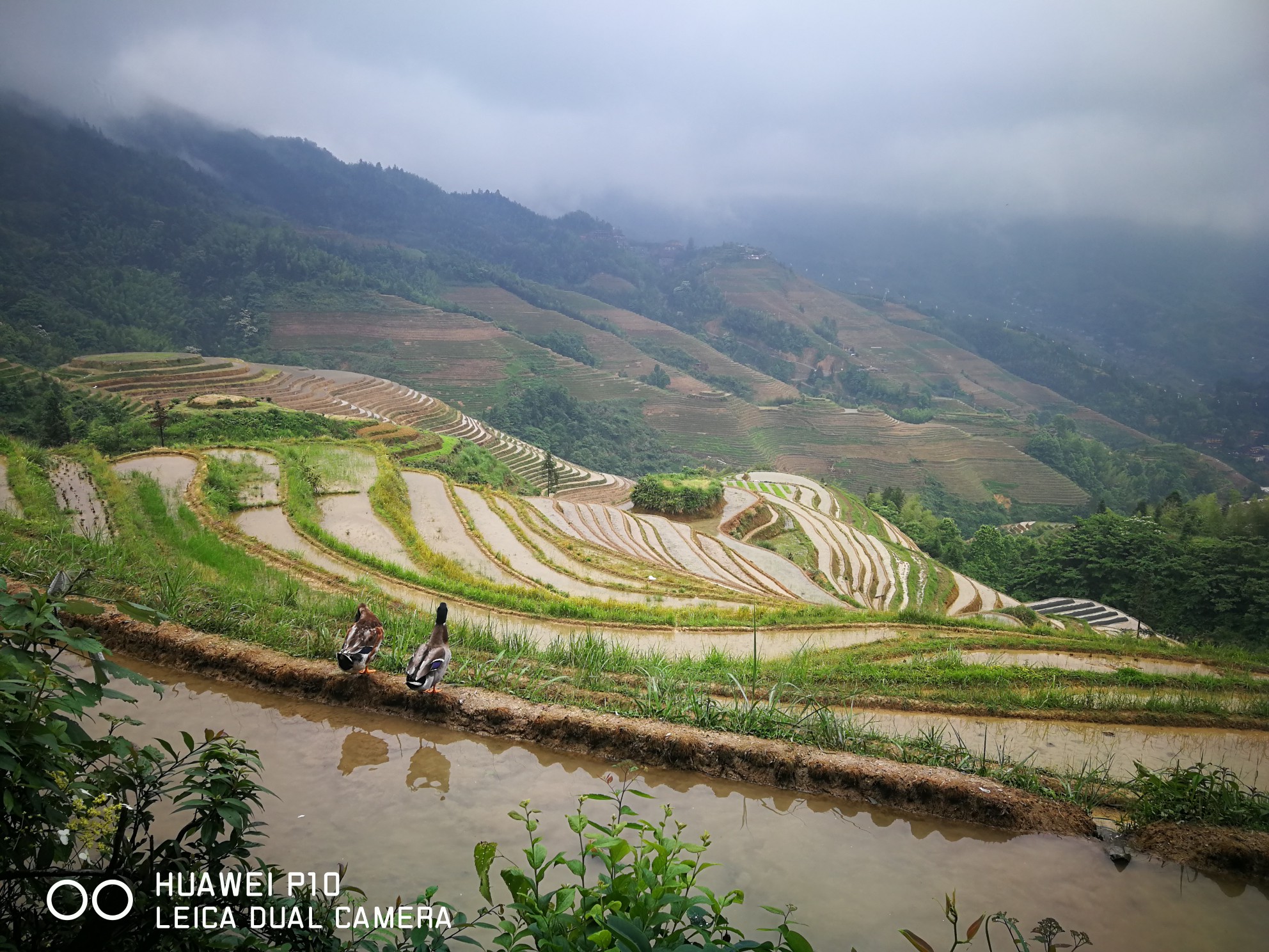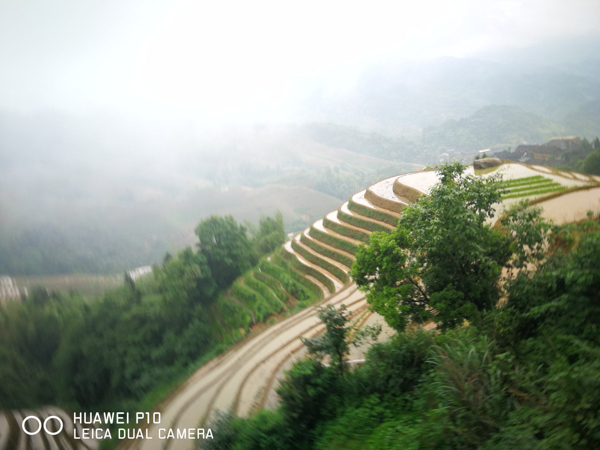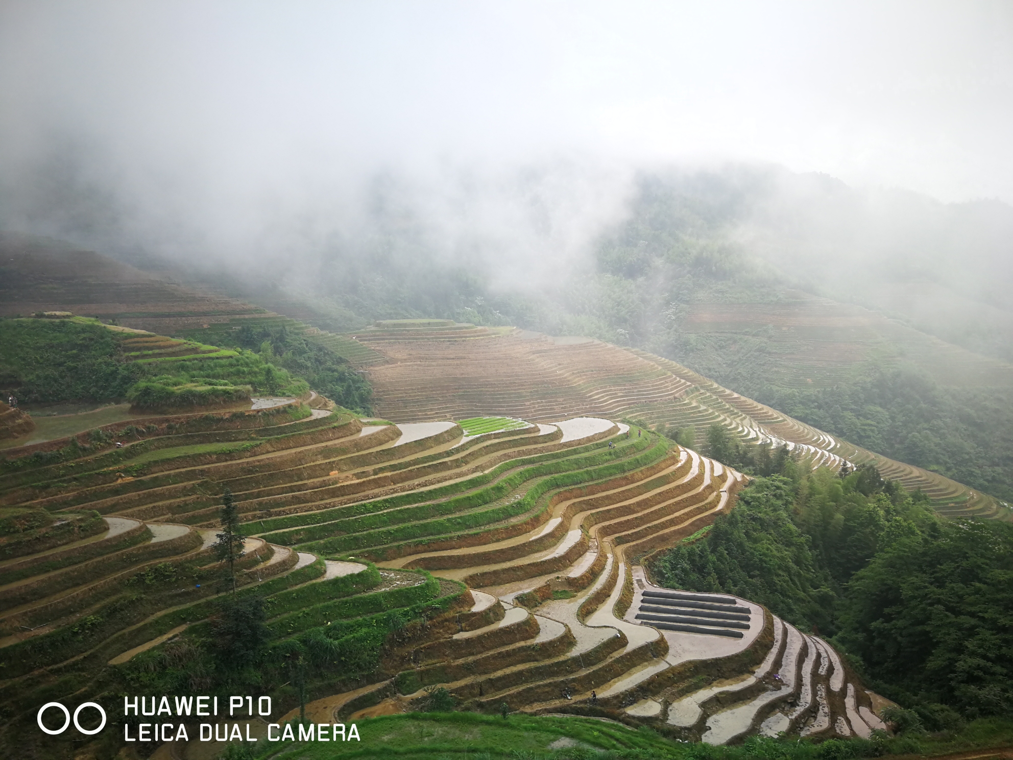 我们早上8点从桂林市区出发,离龙脊梯田景区还有30公里的时候车就开始上山了,车沿着峡谷往山上盘延着。从山上留下湍急的河水翻滚着发出轰鸣的吼声,河水特别的黄,问过司机才知道昨天下了一场大暴雨,河水中有大量的泥沙,平时河水是清澈见底的。由于路基冲坏了好几处造成断路,昨天好多车被迫堵在路上等待抢修,直到我们去的上午都还在抢修,不过我们还算幸运顺利通过没有堵在路上。