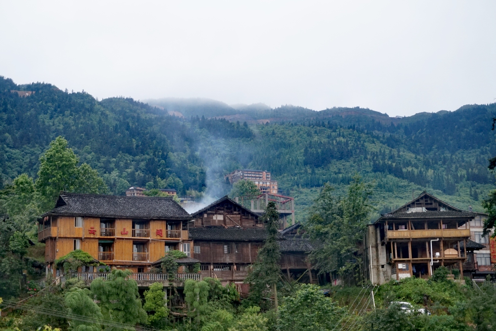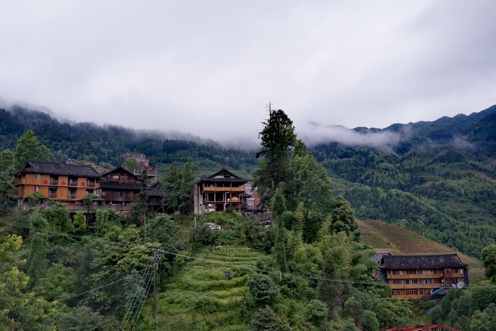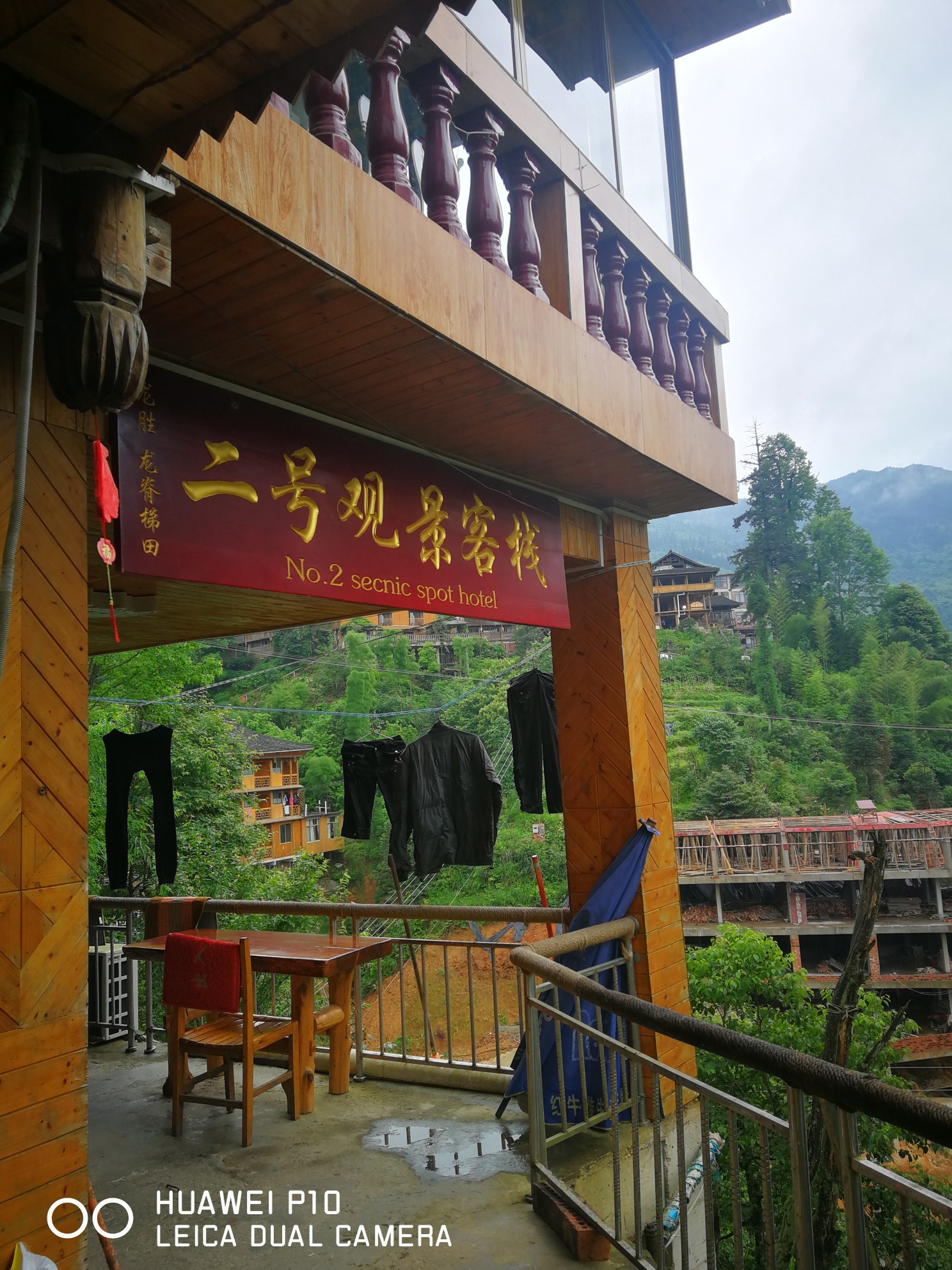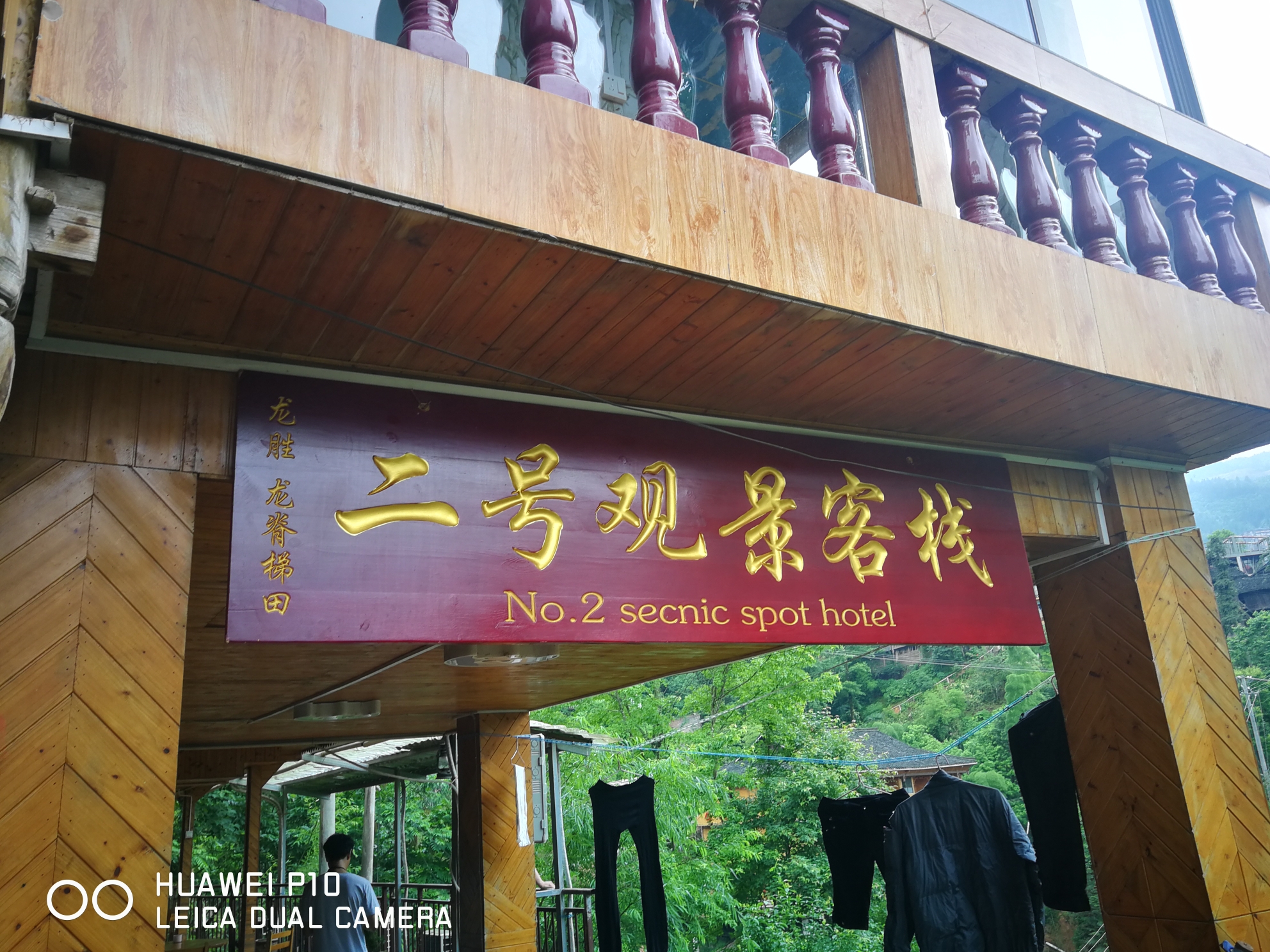 到龙脊梯田观景儿是要爬山的,但我们五个人都拖着很重的行李是没法做到的,当地有挑夫一件行李30元。还有一种方式就是坐缆车,一个人100元也不合适。我们住的二号观景客栈位于山的中间位置,离一号和二号观景台都挺近,所以我当初决定住这个客栈。由于攻略充分我提前联系好客栈老板,让他找好了上山的车,花100元包了一辆SUV把我们拉到二号观景客栈。客栈老板叫潘锦才,人挺实在也挺诚信,房价是按之前电话联系的报价120元一间挺便宜而且是吊脚楼,房间被褥及卫生间都挺干净。