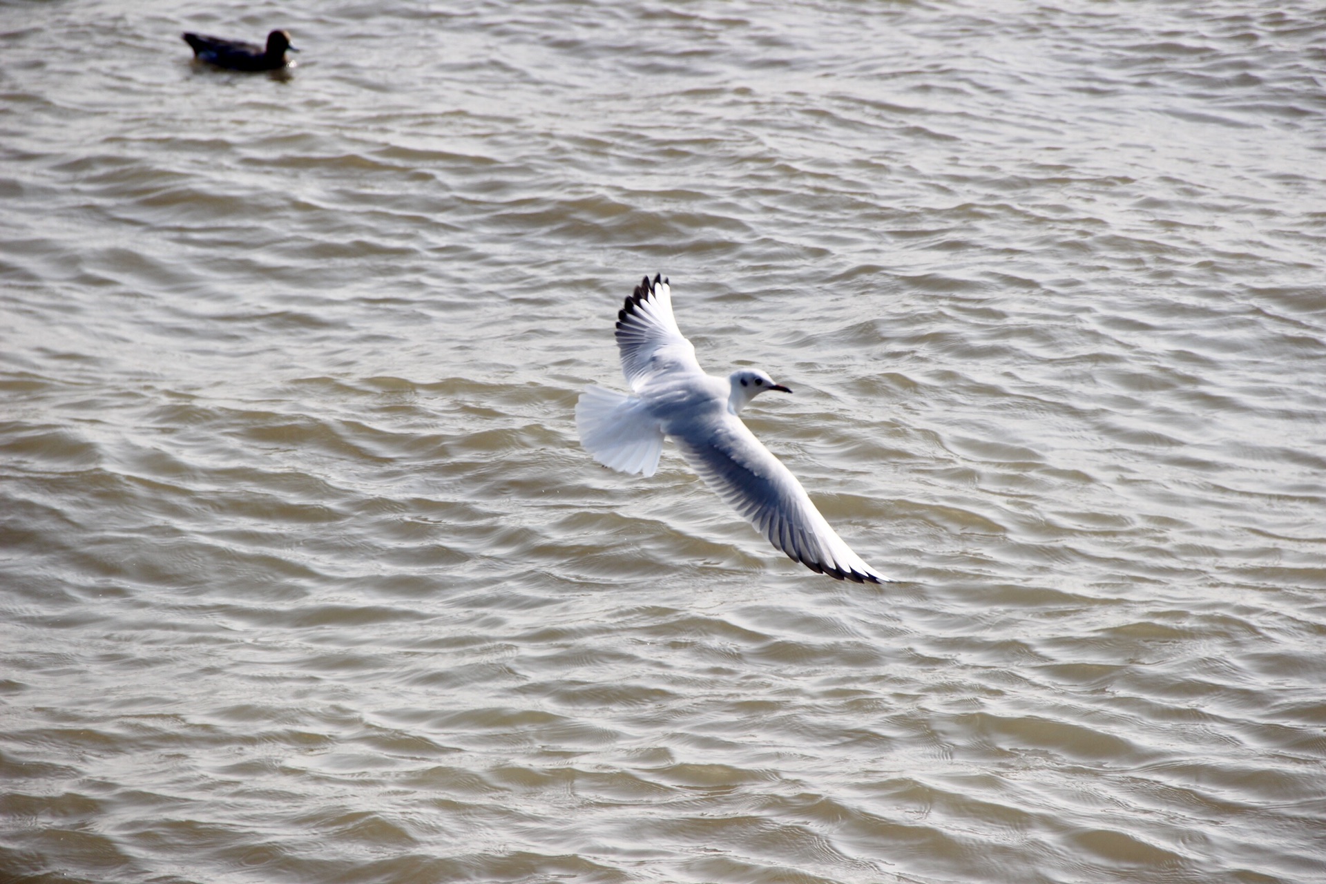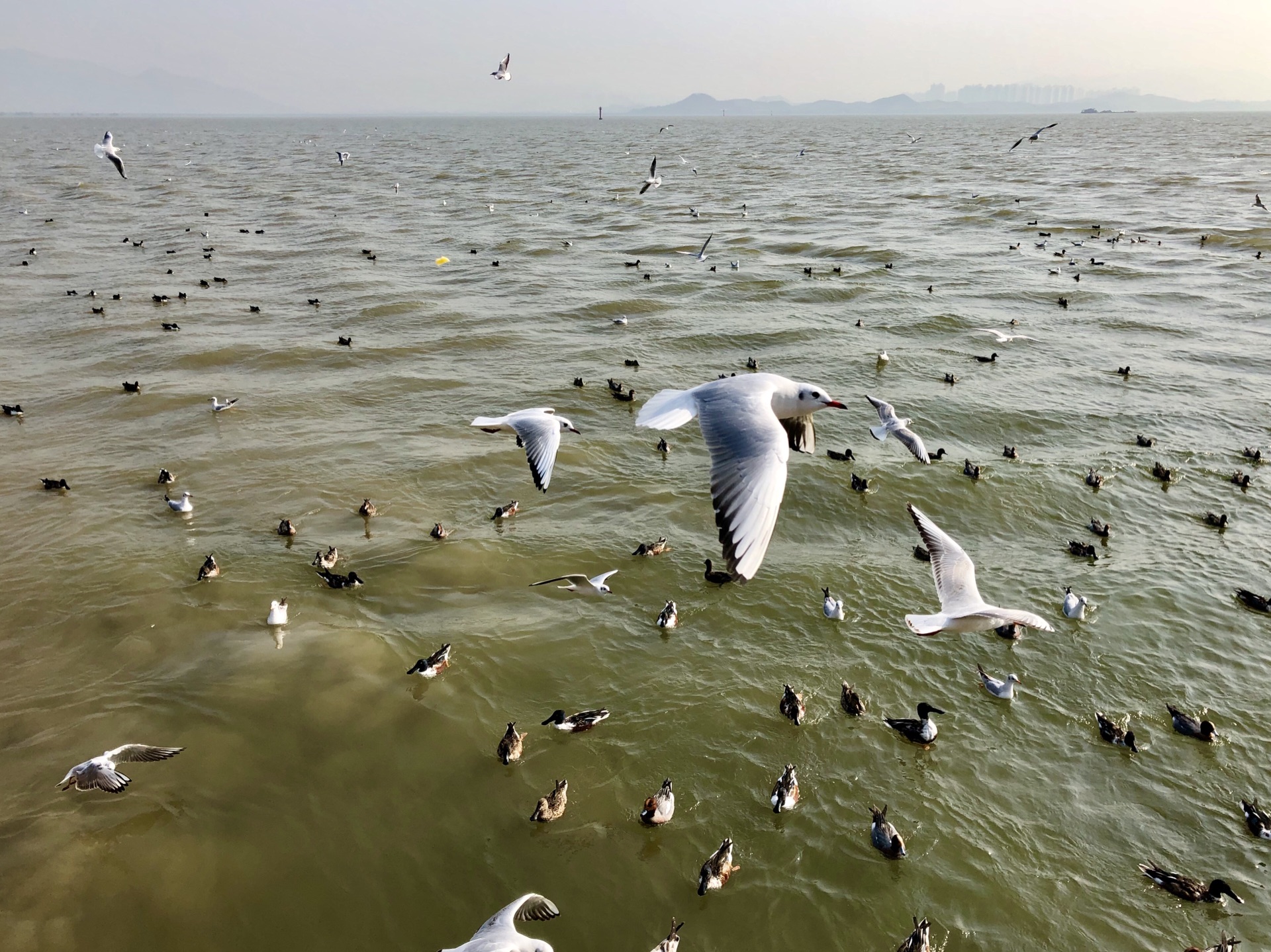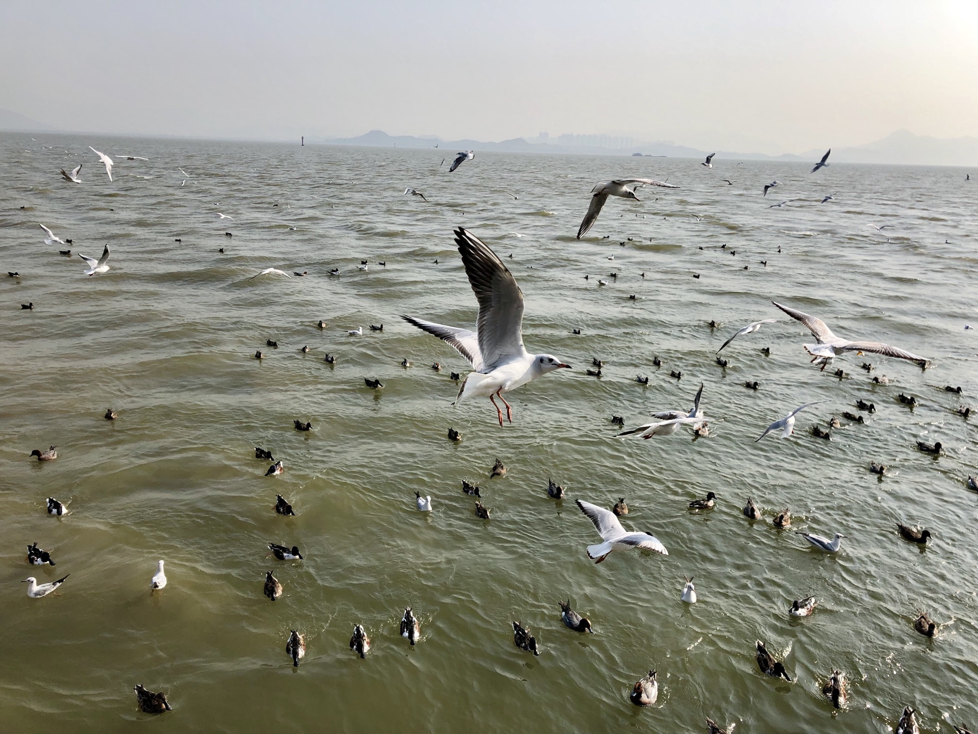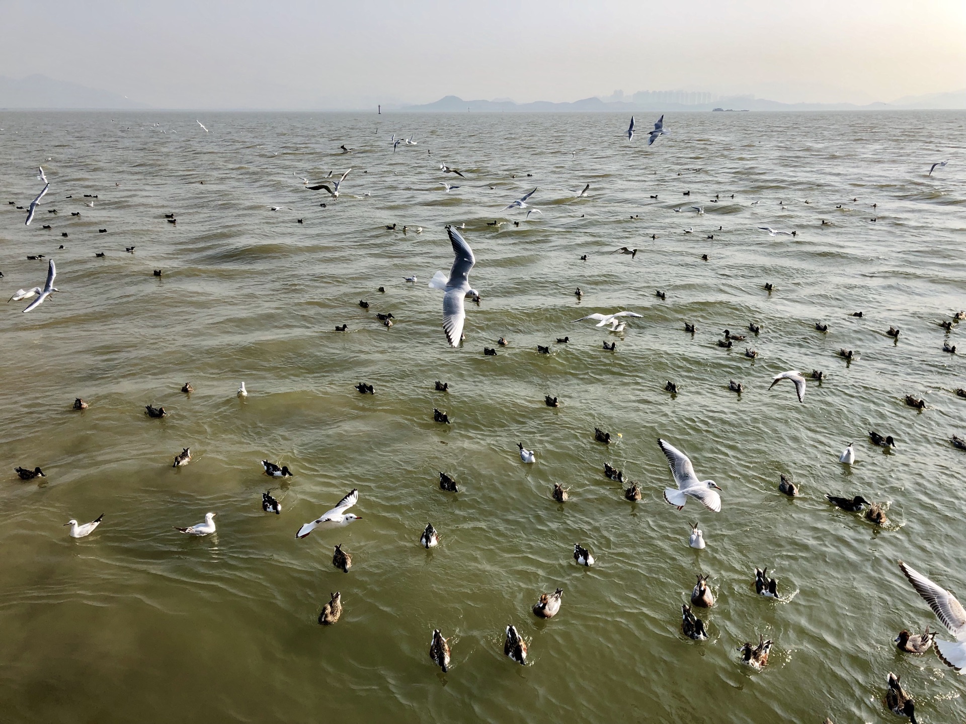 公园中心很多人聚集,走近一看是在观鸟,老妈拿出面包一洒,大家蜂拥而至,抢夺那为数不多的食物,掉进海里的就成了海鸭们的食物!
