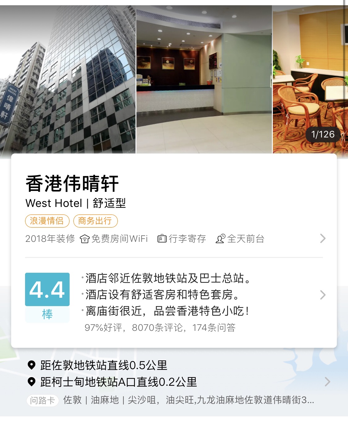 离西九龙高铁站很近,附近还有两个地铁站,还有直达机场和港珠澳大桥口岸的大巴,非常方便,房间不算太小,450/晚,这个价格算很便宜啦!比较推荐!