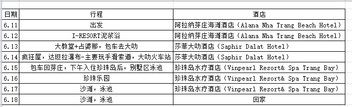去芽庄的机票,直飞和转机都有,直飞越捷航空的多一点,萧山机场直飞国内的好像就中国国际航空,越捷航空因为是廉价航空和团队为主,所以出发的时间到芽庄都是半夜了,带娃的我一般总是习惯尽量不选红眼航班的,本来选广州中转的,后来拿到国航这班时间和价位都可以,就果断订票了(出发北京时间14.55--芽庄时间17:20,回程芽庄时间16:20--北京时间22:50),鉴于第一天到已经晚上,所以打算先芽庄市区过渡一下并在第二天把泥浆浴给玩了,然后转战去大叻,大叻回来后直接去珍珠岛。酒店和行程如下表: