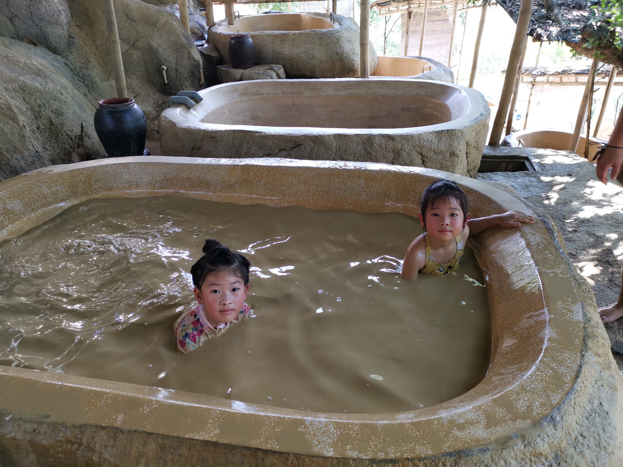 我们定的是6人以上的大池,现场放的泥浆,刚开始进去的时候觉得有点烫,过一会儿就适应了,比看上去的要稀很多,滑滑的,还算舒服。泥浆浴是上面有草棚挡着的,不会晒。