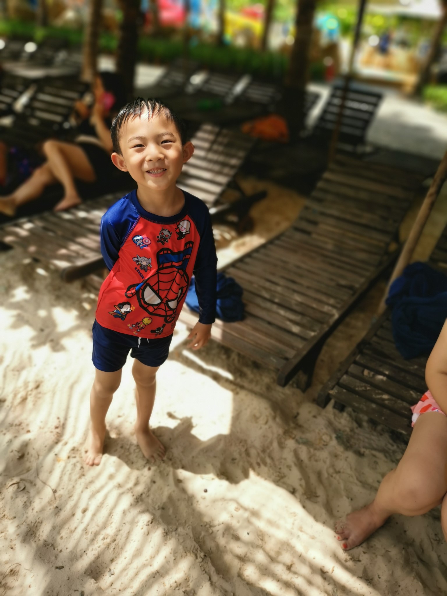 因为太阳太大,其他的温泉池和泳池都是露天的,我们都放弃了,直接坐车去了水上乐园,接送车在就餐区旁边,直接过去,一般很快就开了,几分钟就到,有一两个项目要比较大点的孩子,其他都是适合像彤宝这种小家伙的,但是很晒很晒,真的很晒,后面有个大的泳池区是有沙滩椅和遮阳伞的,但是其他能玩水的都是直接晒的。左右两边的两个儿童泳池深度不一样,右边的比较浅,左边的有80公分,彤宝过于自信结果脚一滑直接需要救援,幸好晨妈离的近出手援助