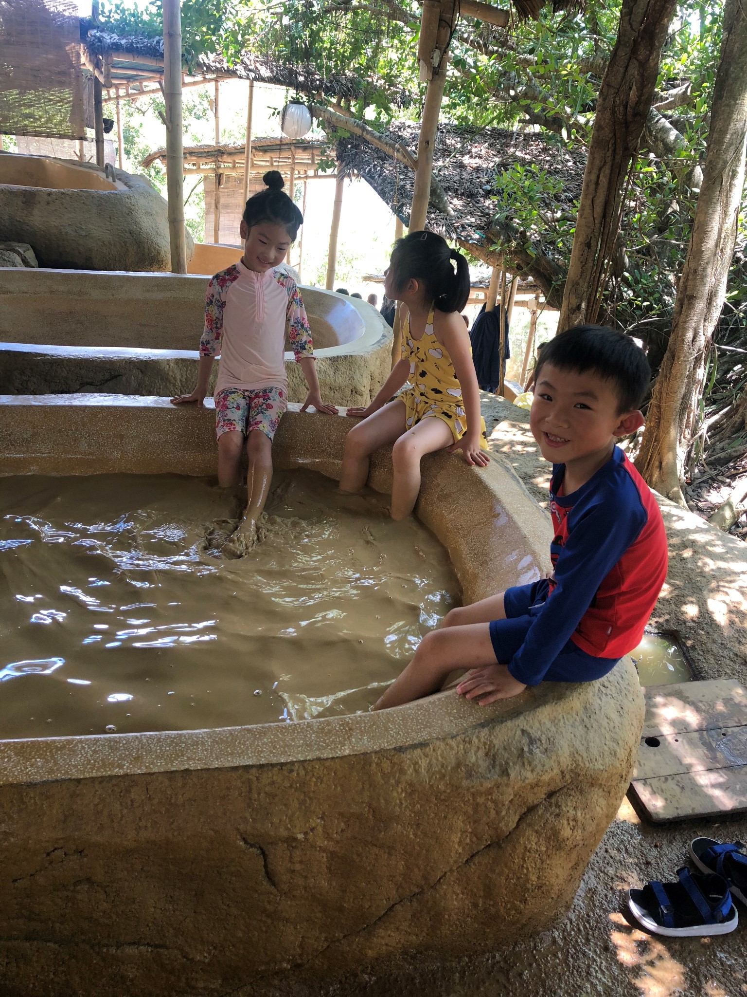 洗好泥浆浴后附近都有淋雨的喷头,你必须要把泥浆都洗干净了才能去其他温泉池或者泳池玩水,这个冲冲真的要费很多时间,尤其是女生的泳衣,海绵区真的要冲N久,给小朋友冲最好找那种能拿下里的冲头,毕竟直接头上冲下来的花洒还是有点扛不住,水是温水,不过洗好后还是要把他们提供的浴巾给披上,风吹过还是有点冷的,话说泡过好像是会白一个色