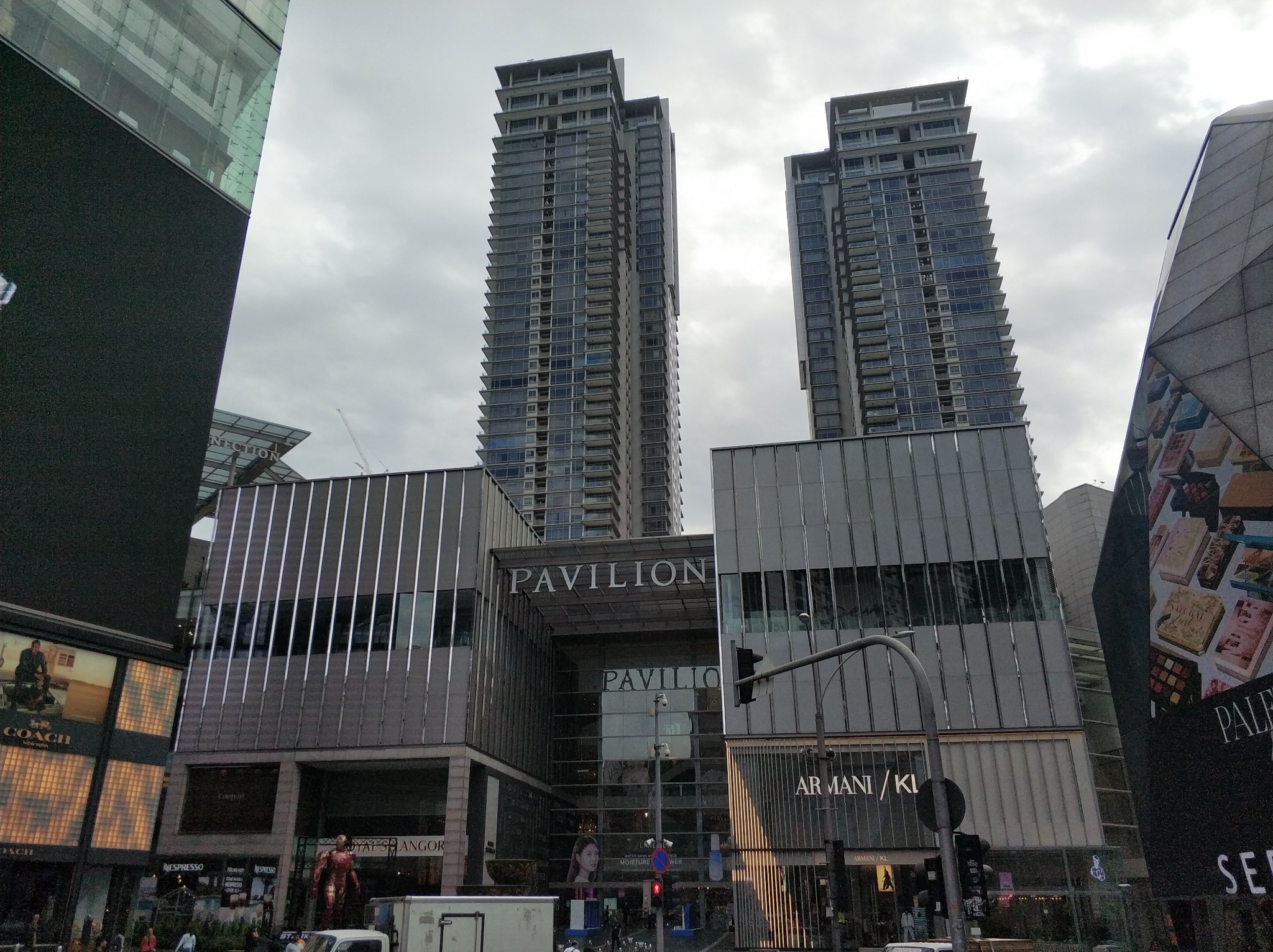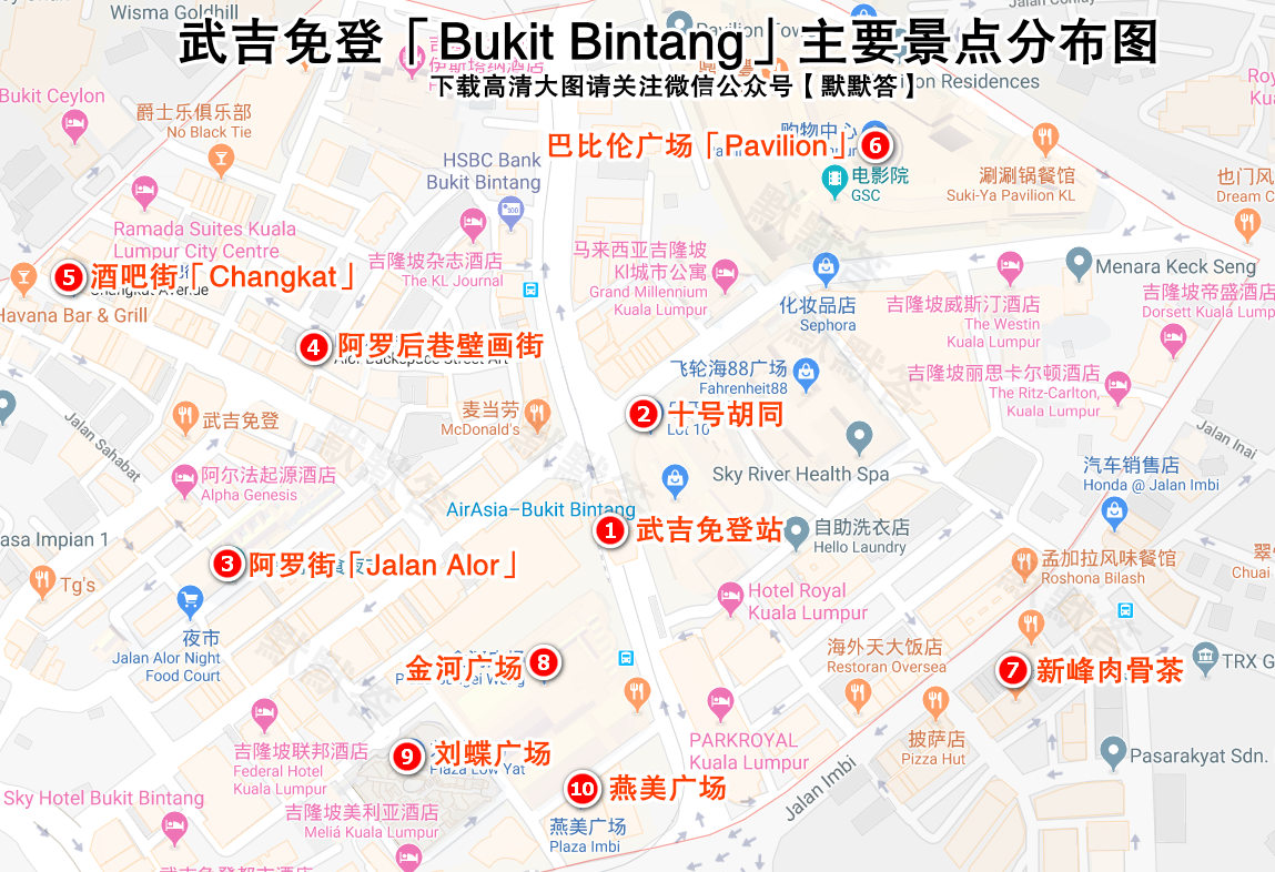 吉隆坡的金三角区域实在武吉免登,坐LRT到达Bukit Bintang站下车,这里有大型商场Pavilion柏威年,还有阿罗街为主要景点。