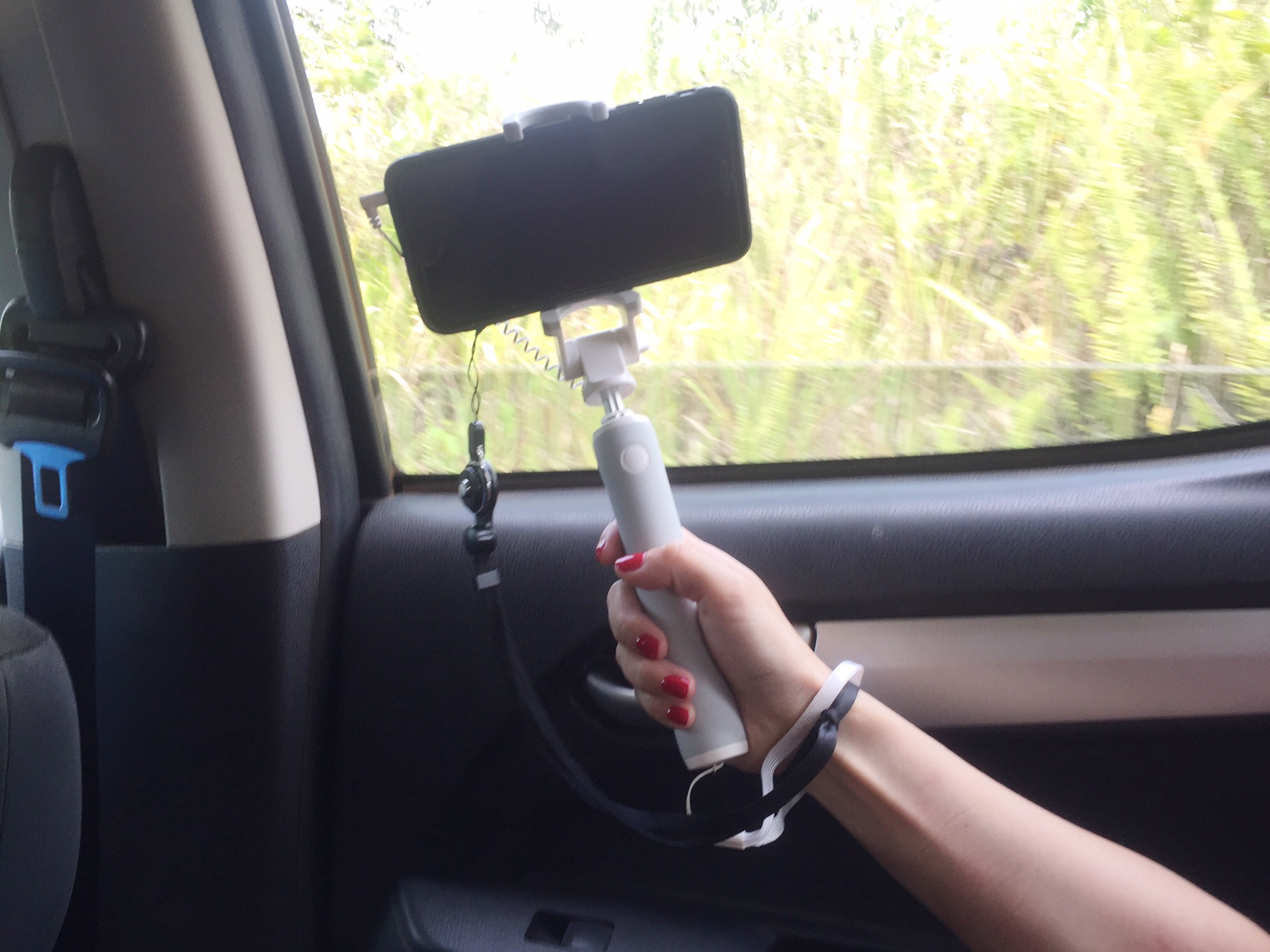 当然如果都没订,想用手机拍也行,但是掉下去,是没有人帮忙捡,也没有人会负责的。不过我试过了,这样绑在手上,这样不会掉,亲测有效哈哈哈哈。记得自拍杆伸长一些,这样拍才看,太短了就拍得太近,只能拍到头。我就是个例子,不好看了。
