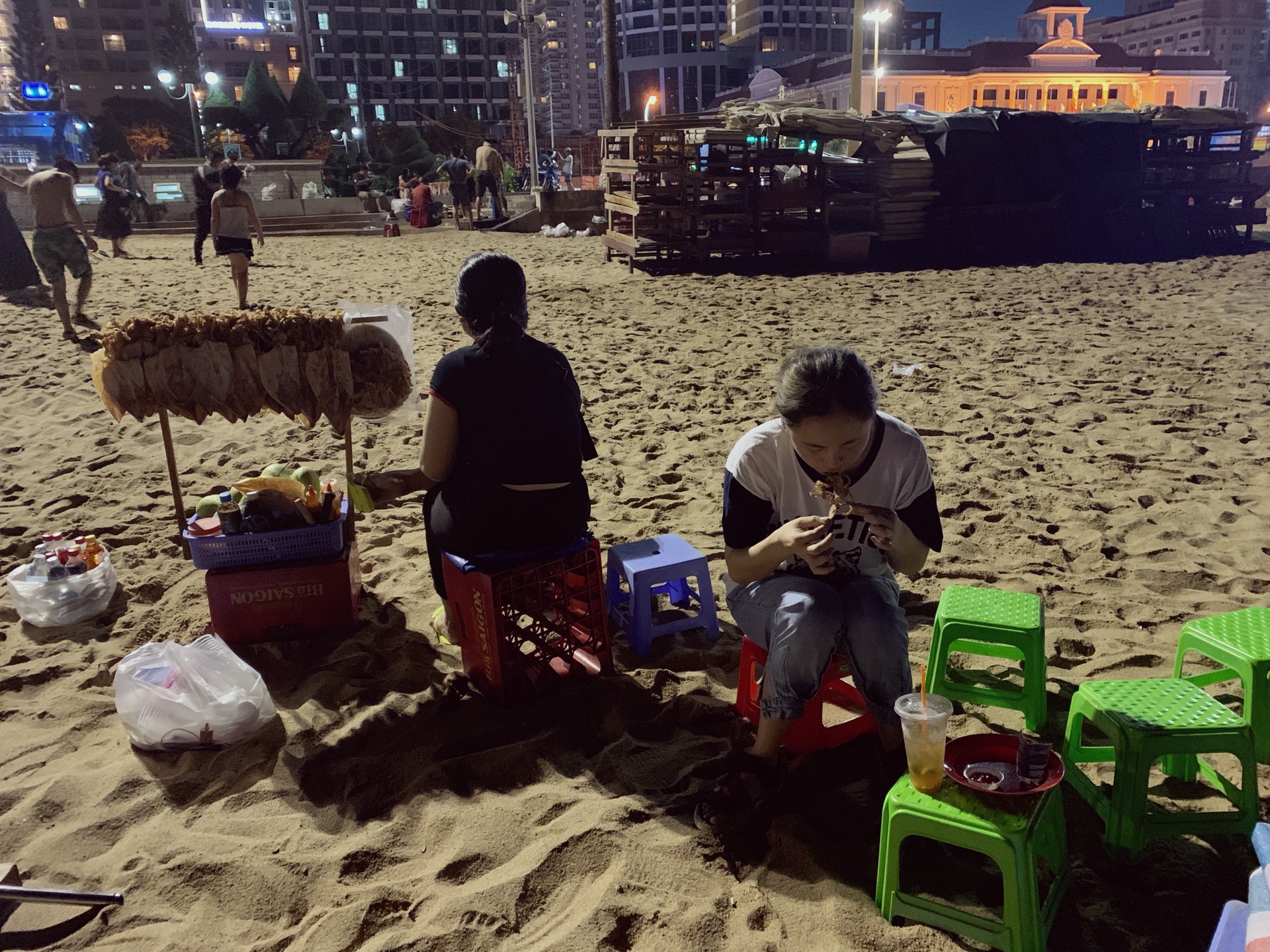 在芽庄海滩看到一个越南小姐姐在卖干鱿鱼,之前霸小姐一直想尝试,于是在我和越南小姐姐的一轮讨价还价中,霸小姐终于坐在沙滩上啃起了鱿鱼。那个鱿鱼会现在旁边的碳火上烤一下,然后鱿鱼就卷起来了,再用一根棒子敲平鱿鱼,就可以吃了,很有嚼劲,是嚼到后面咬肌会酸的那种很有嚼劲,但是很有鱿鱼的风味,有看到的话可以多人分享一只,毕竟一人吃的话后面真的会嚼到你怀疑人生