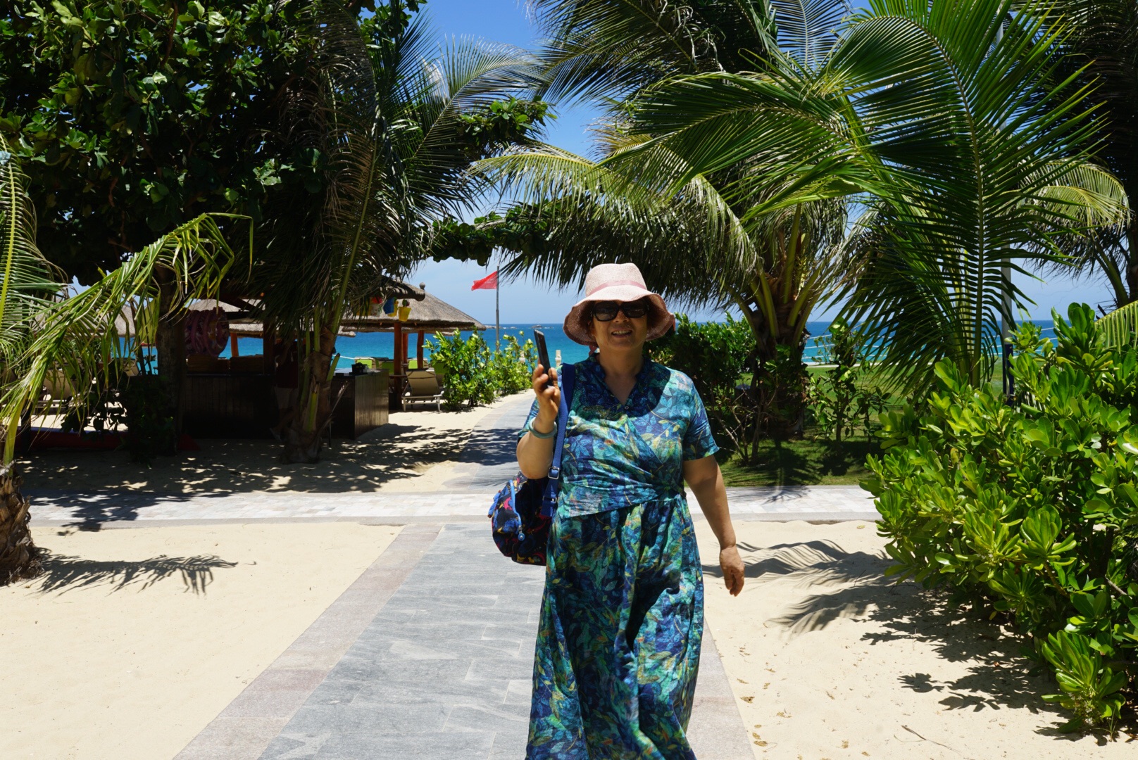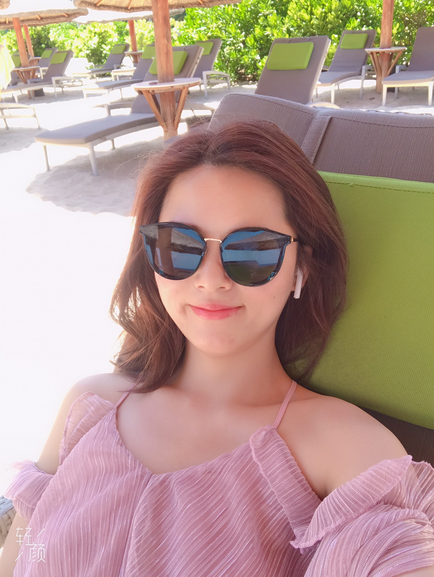 酒店的沙滩,沙白海清,侯女士很中意啊。