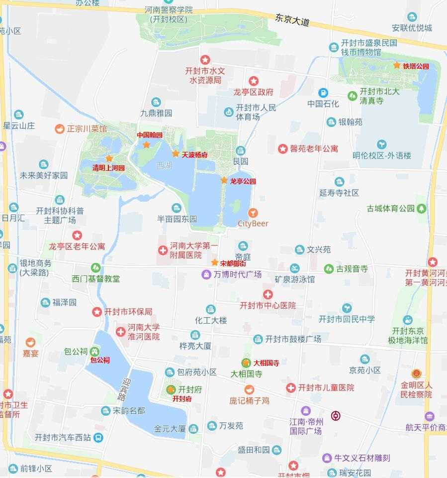 主要景点有开封府、包公祠、大相国寺、清明上河园、中国翰园、天波杨府、龙亭公园、铁塔公园、宋都御街、七盛角等。开发老城区面积不大,各景区之间距离也不太远,公交车或者出租车都很方便。