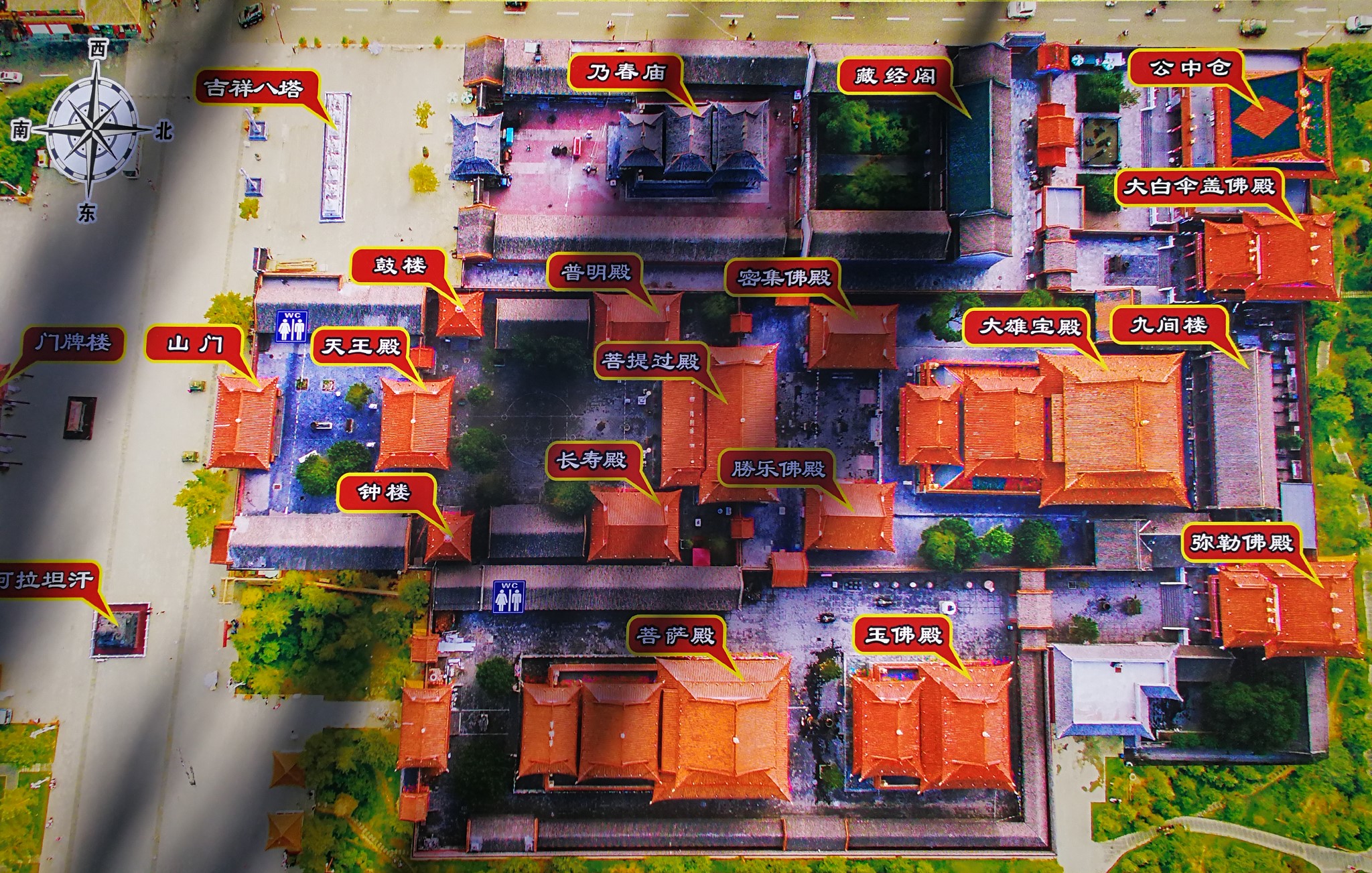 下图上中下三个区域,主要游览区域是中轴线上的这部分,最下面的菩萨殿和玉佛殿是近年新建的建筑,上部主要是办公区域,也