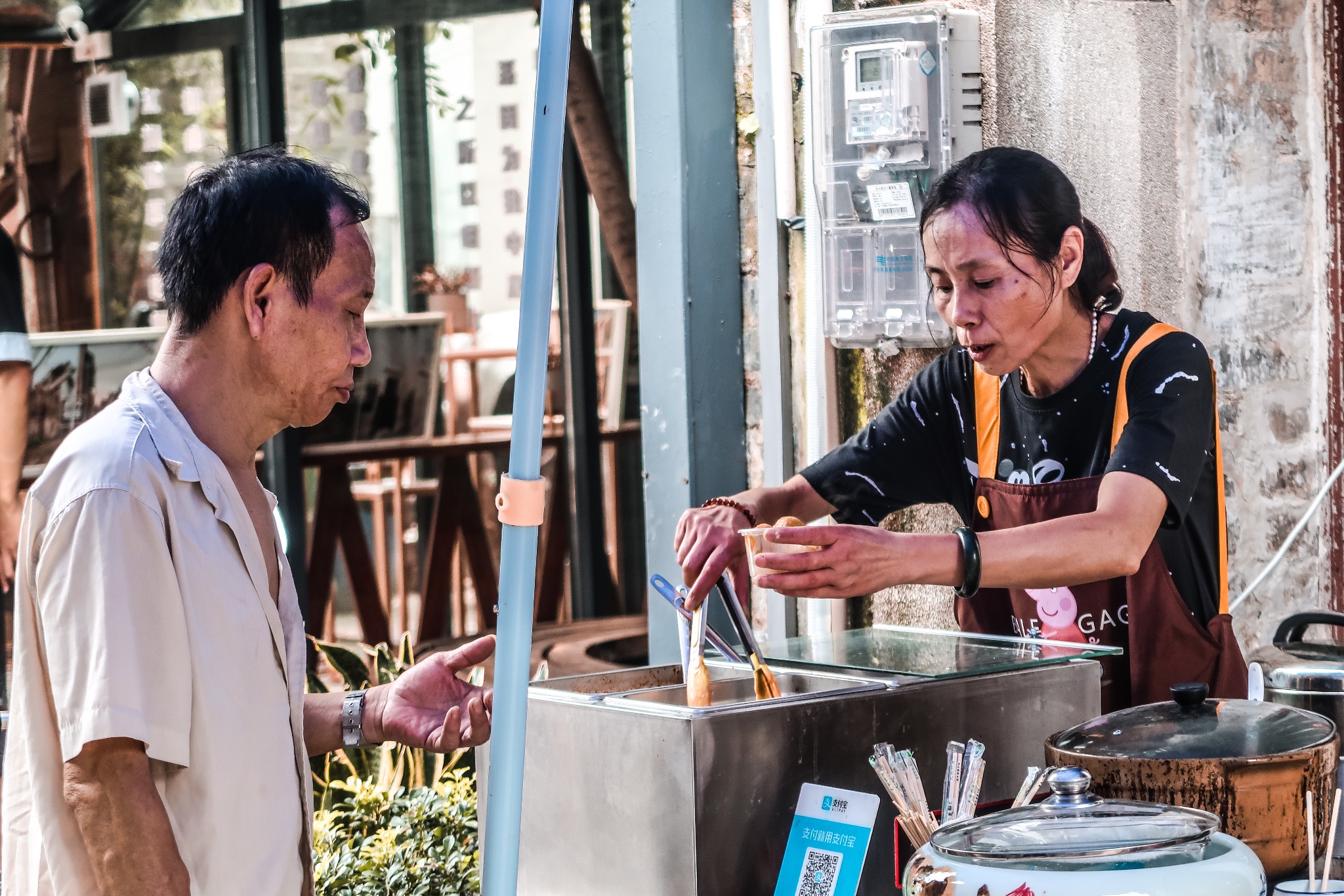 永庆坊里虽然有进驻很多高大上的餐厅、有情调的食铺,但是我个人认为,来到这里,还是要品尝一下西关传统美食。小巷里,就有很多老街坊在家门口摆起小吃摊,不用吆喝叫卖,只要闻到这些美味小吃的香气,我们就会自动走去觅食。