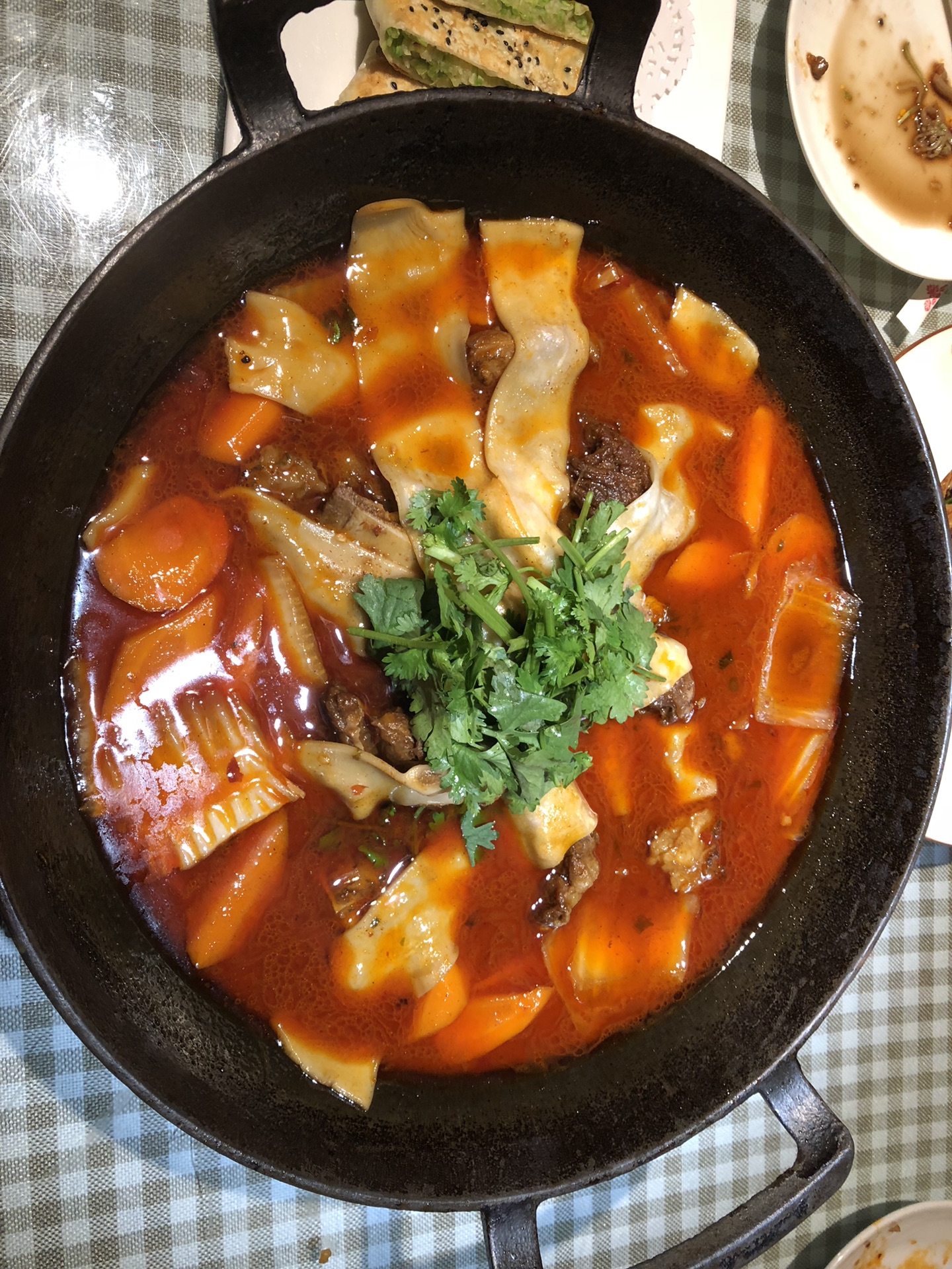 在银川找了一家私房菜,叫做裕雅苑,风评不错,而且据说服务特好。点了四五个菜,第一个菜上来就蒙懵了。盘子里的菜比菜单照片上多出二倍。这个牛肉杂烩端上来的是一口平时炒菜的生铁锅。