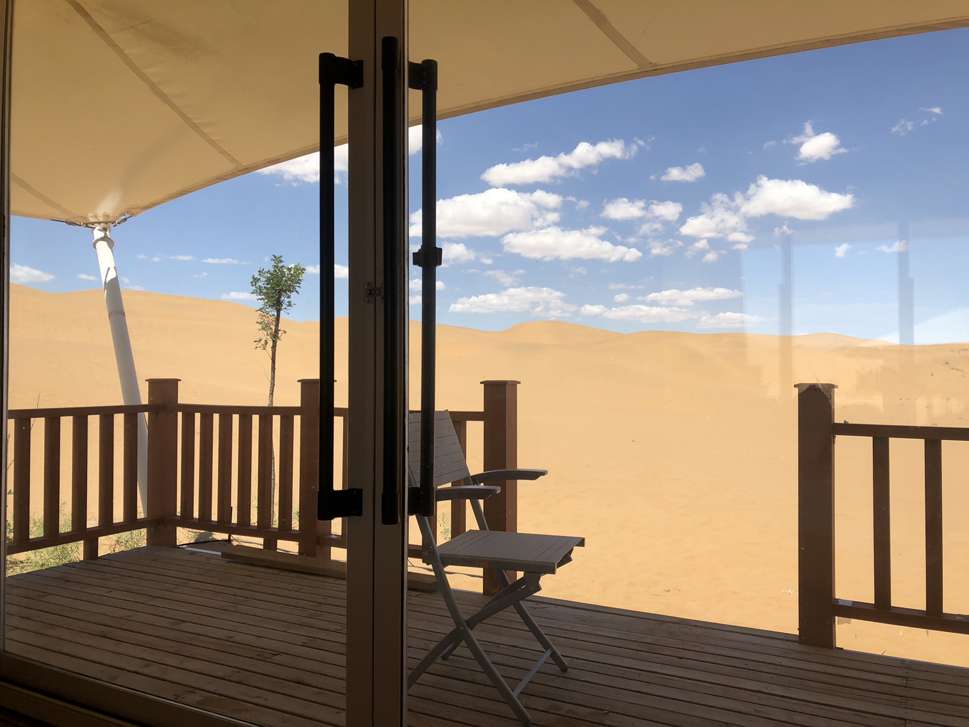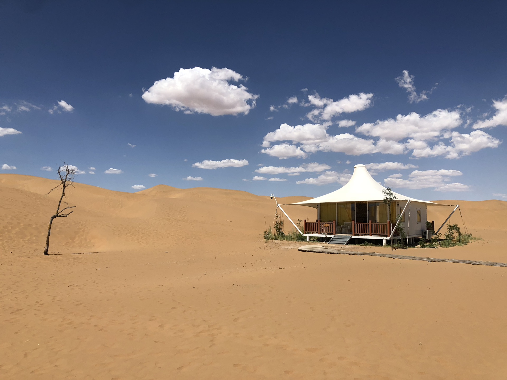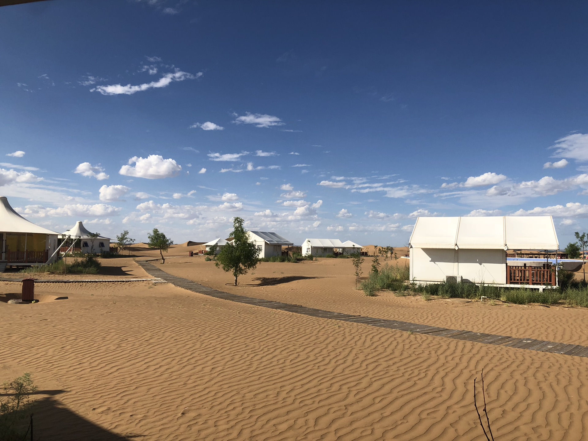 整个行程住宿最大的亮点是在腾格里沙漠里的住宿。之前在筹划行程时,一直在纠结大乐之野中卫和西坡中卫这两家民宿,都是黄土里长出的房子,看着很有意思,因为这两家都有一院两房的独门独院,在我纠结期间,他们的价格在不停的上涨。这时,我偶然发现了一家腾格里沙漠腹地里的酒店。除了住店,还可以露营,我们就遇到了一个小朋友夏令营团体在这里安营。
