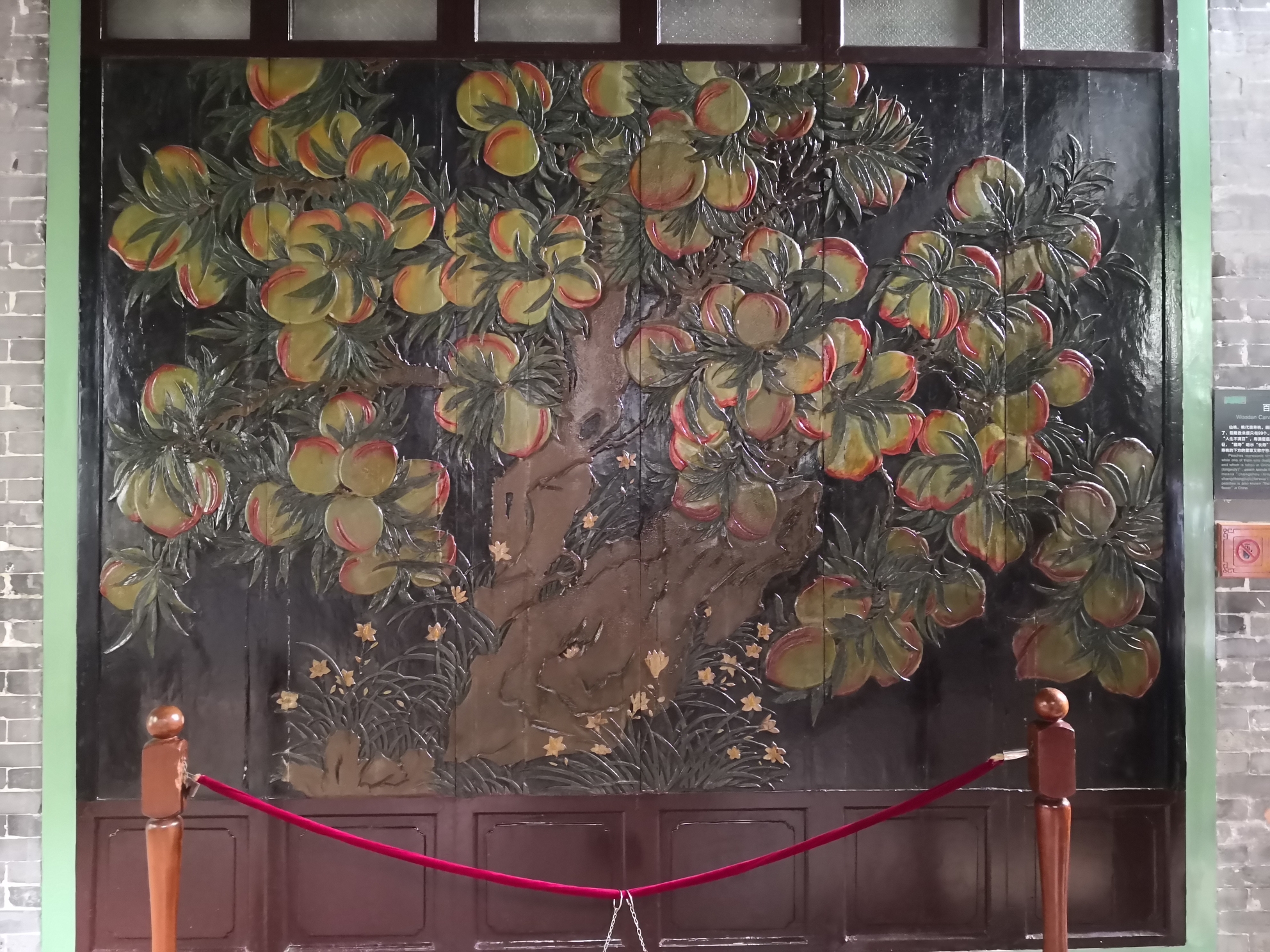 百寿桃木雕。画面中的桃子有一百个,但其中有一个被藏起来了,粗略数来便只有99个,因为“百”是满数,民间讲究“寿”不能满,“人生不满百”,寿满便是寿尽。“藏”与“长”谐音,桃子是寿命的象征,“藏寿”暗示“长寿”,再加上九十九又切合了“长长久久”之意。寿桃的下方的萱草又称疗愁、忘忧草,是中国的“母亲花”。