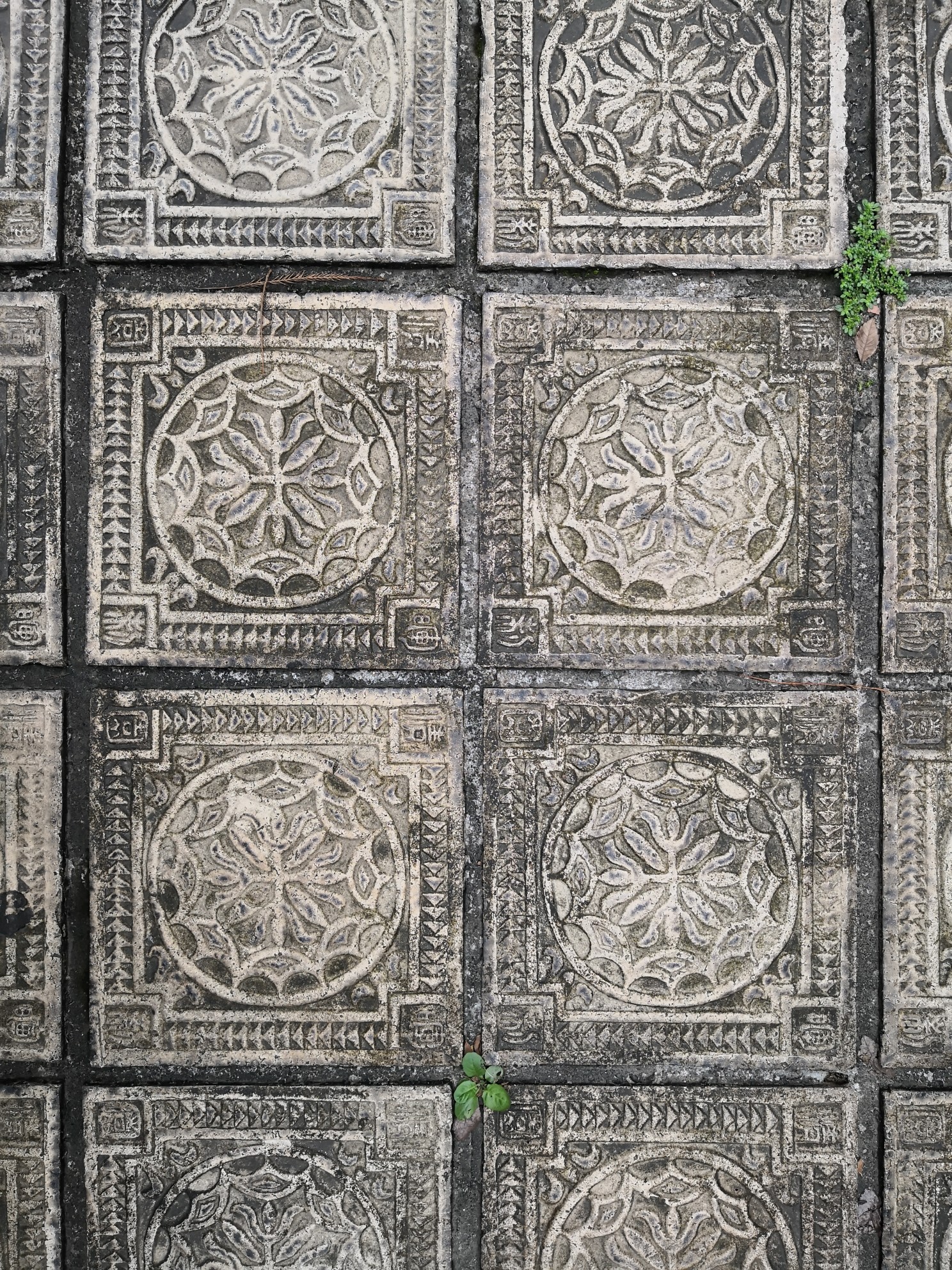 斑斑驳驳的四四方方的地砖,植物顽强的生命力,从砖缝中生长出来。