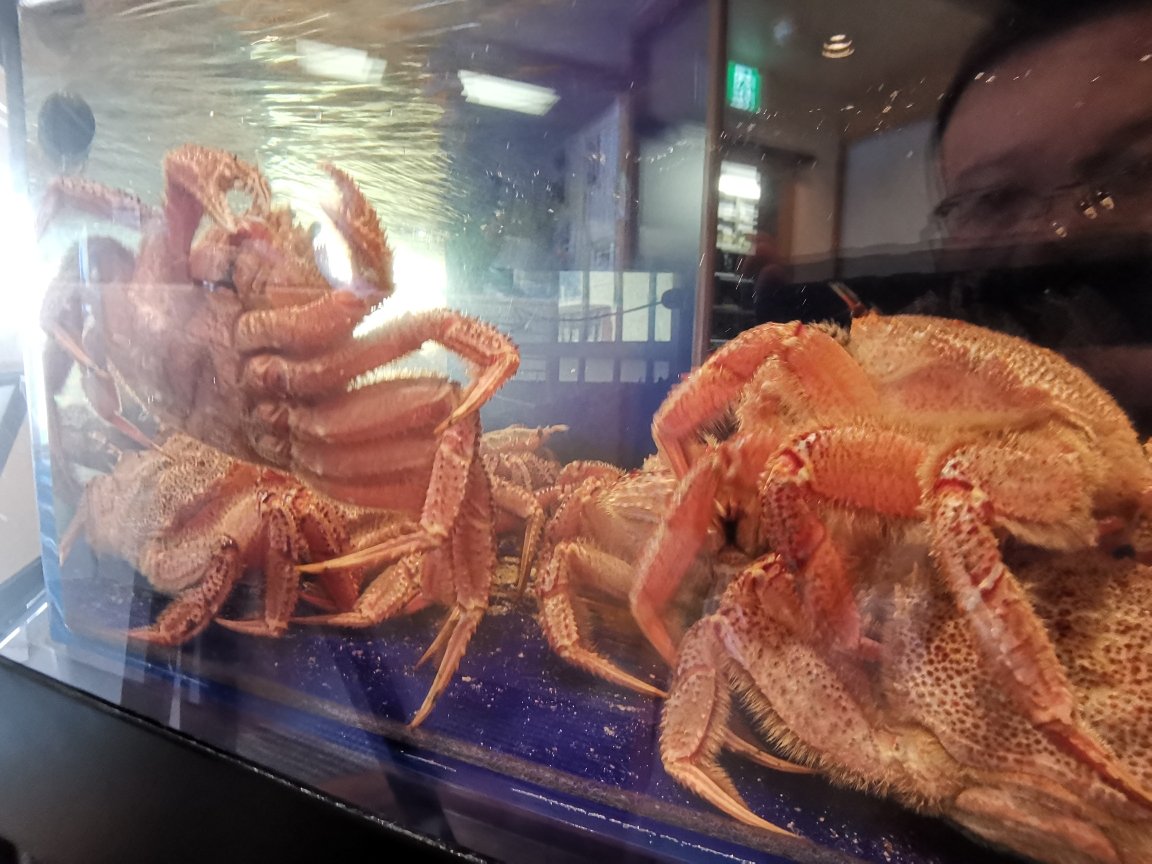 从奈良公园出发11点半,驱车半个小时就到了蟹道乐奈良本店。提前让斑马导游升级了套餐,很朴素但很有气势的店铺,进店需要拖鞋,转个弯就看见了寄养海蟹的大缸,真是满满一缸全是大螃蟹,个个蟹壳就三十厘米,算上蟹腿应该有六十厘米大小了吧,(后面去海游馆才知道这些都是小螃蟹