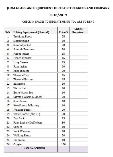 关于装备的租赁费,是可以同旅行社协商的。下面是我找的坦桑的旅行社给我的租赁费价格表,但我在行前同旅行社的负责人—Yesaya 的沟通中,已经协商一致,所有的装备,我们都可以免费租赁。所以我们只带了一些比较私人的装备,像登山杖、驮包、睡袋(我们自己准备了抓绒内胆)这样比较占空间的装备,我们都是用的旅行社的。