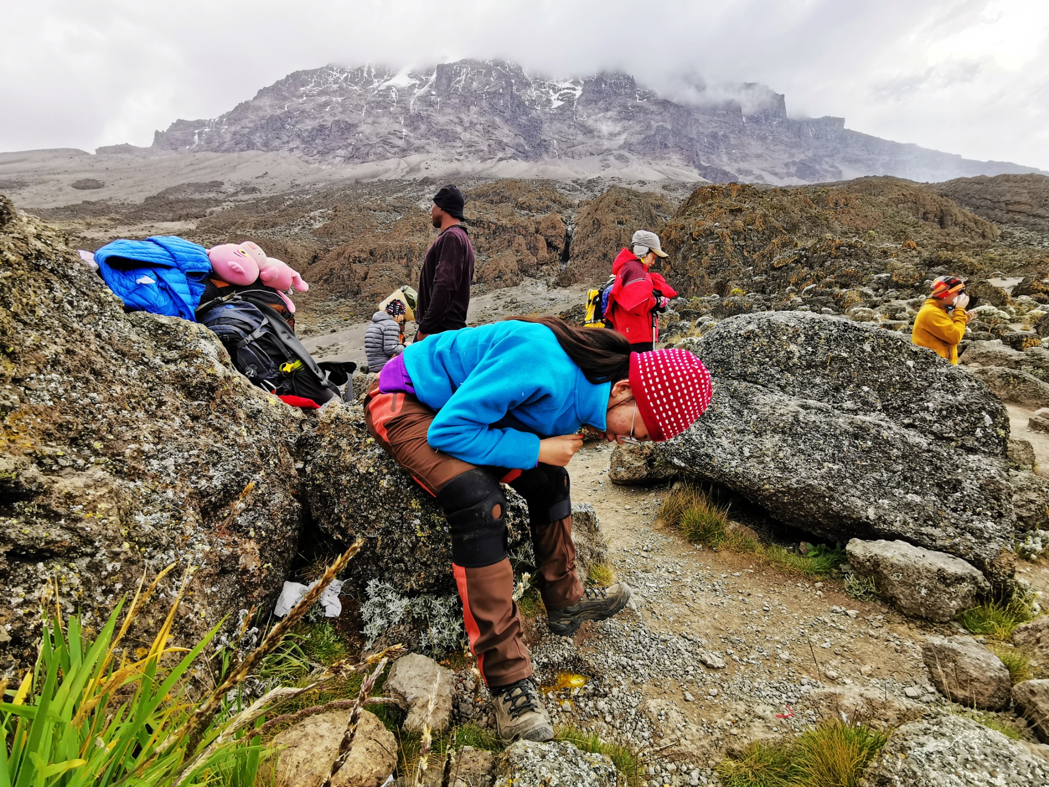 而在六天的接触中,总会有一些事情让你感动;让你体认他们的贴心;让你感受他们发自内心的对你无微不至的照顾。体力达人还好,如果是像我这样体弱的,还有像我女儿这样年龄偏小的,就会感受更深。尤其是在登顶那天,在我已经无力完成独自下撤的时候,是向导和挑夫,连背带架,把我“拖”回营地的。