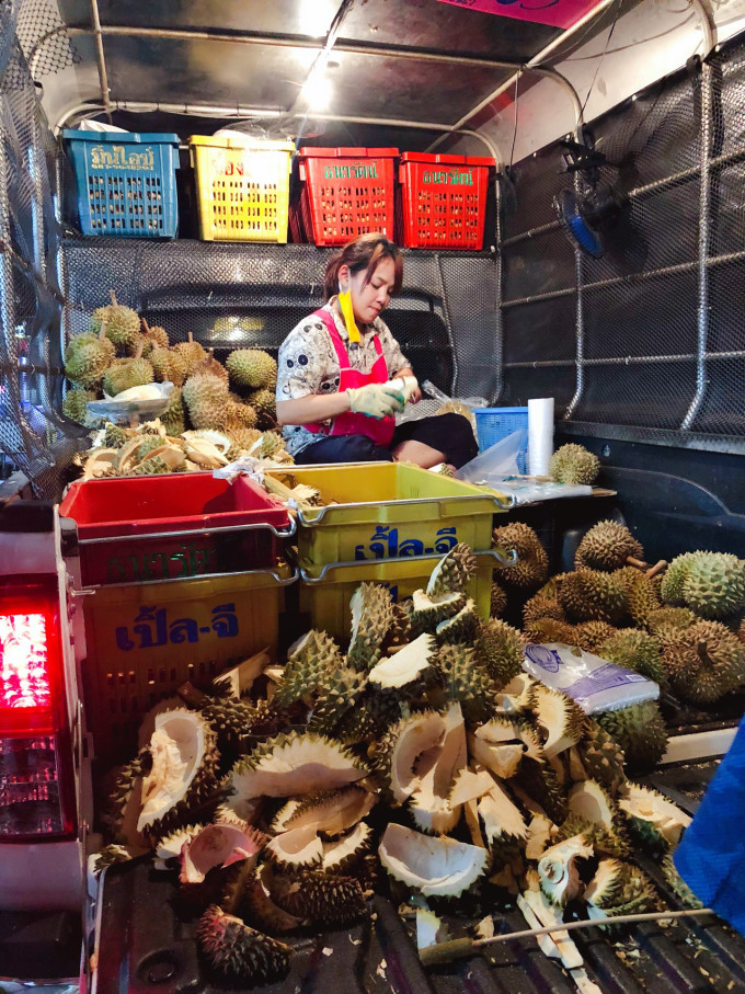 酒店门口的榴莲车,记录在曼谷吃到的大水萝卜榴莲。