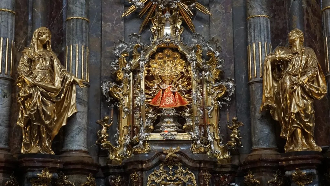 所以终于正经的走出吃喝住进入到布拉格的景色中,只是这两天天气不佳有点可惜。出了酒店一路向北走,先到的是以布拉格圣婴雕像闻名的胜利之后圣母堂(Kostel Panny Marie Vítězné),教堂里有一个专门的小型展室,用来展览圣婴雕像的冠冕和长袍,不同节日,圣婴会穿着不同颜色的服饰。