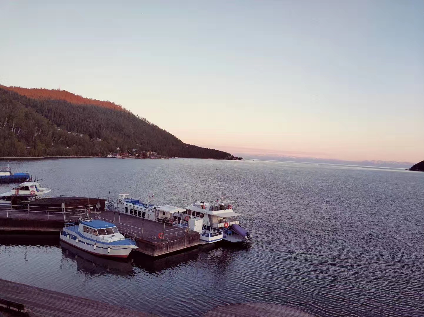 酒店一栋栋的小别墅,外边就是贝加尔湖,视野无限好,夕阳非常美,且很多海鸥飞来飞去。
