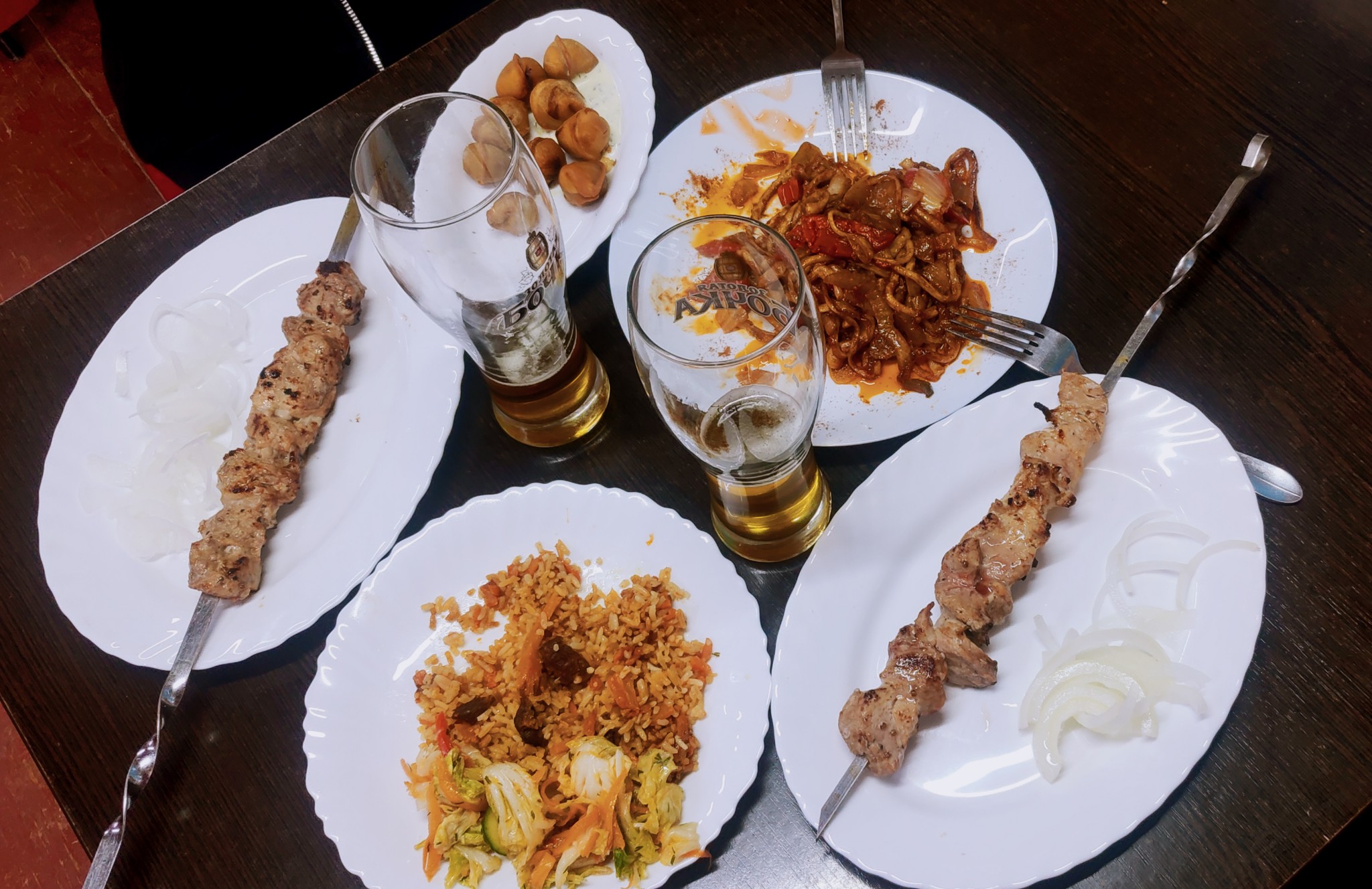 晚上在胡日尔村逛,找到小店,点了烤肉啤酒,味道还可。