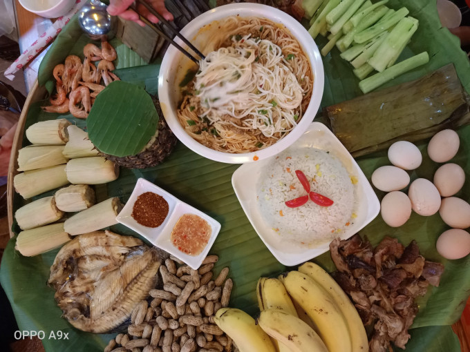 穿上的套餐,我们一桌六人。花生,烤鱼,鸡肉,玉米都好吃,那个面不好吃。