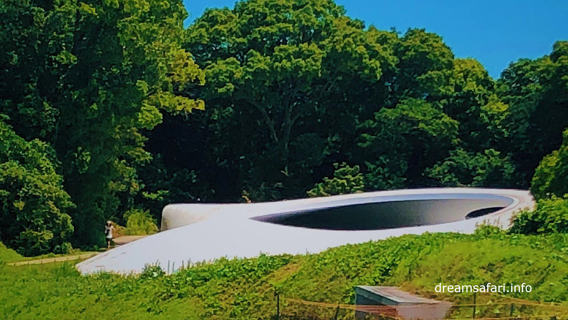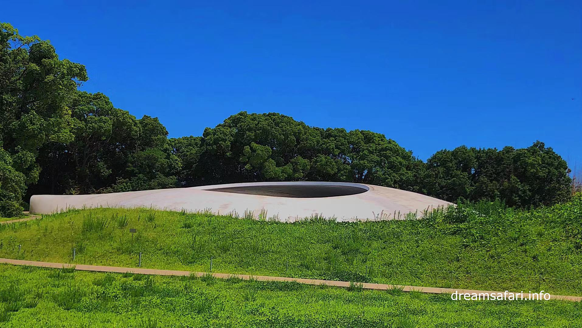 丰岛美术馆(编号:te13)是可能是岛上最知名的艺术品了。濑户内海艺术祭期间,有一部分的门票需要预约,另外一部分的门票通过现场取号排队的形式发放。当我决定去濑户内海艺术祭的时候,预约的门票已经卖完了。于是我坐船到了唐柜港之后,顾不上吃饭,第一件事就是坐车去了丰岛美术馆取号。好在那天人不算太多,取到了1个小时之后入场的号码。想着这一个小时去吃饭肯定来不及,索性就在附近逛逛吧。丰岛美术馆就像是地上的一个水滴,这也就意味着要拍它很难,一个小时都没找到特别好的拍照角度,要么是有遮挡,要么是拍照的位置太低……这是我拍的照片里面唯二能看的了: