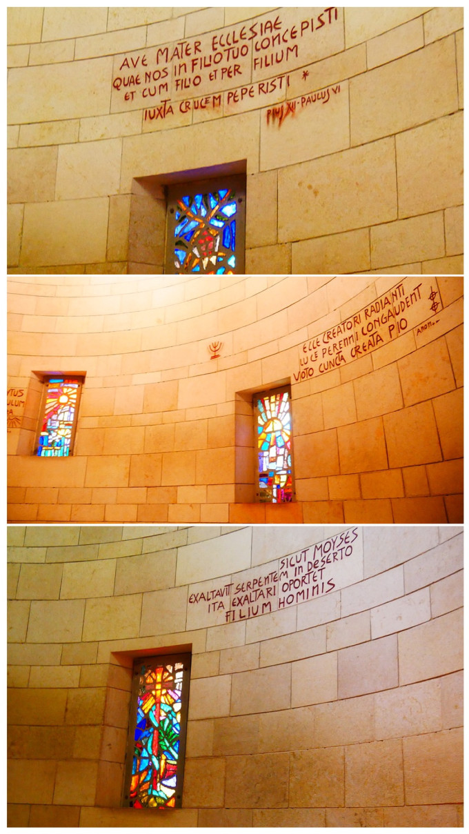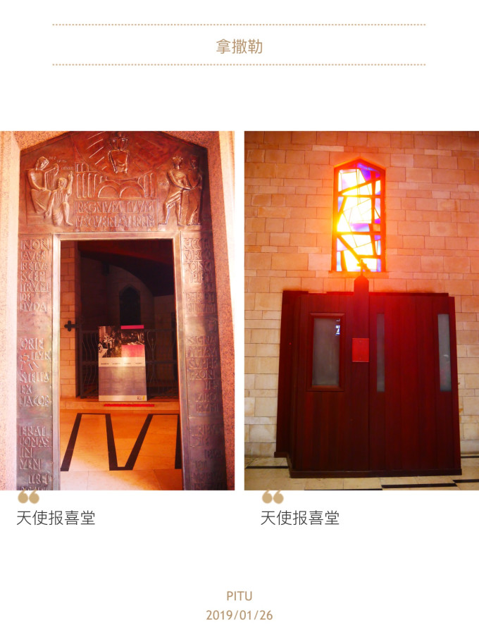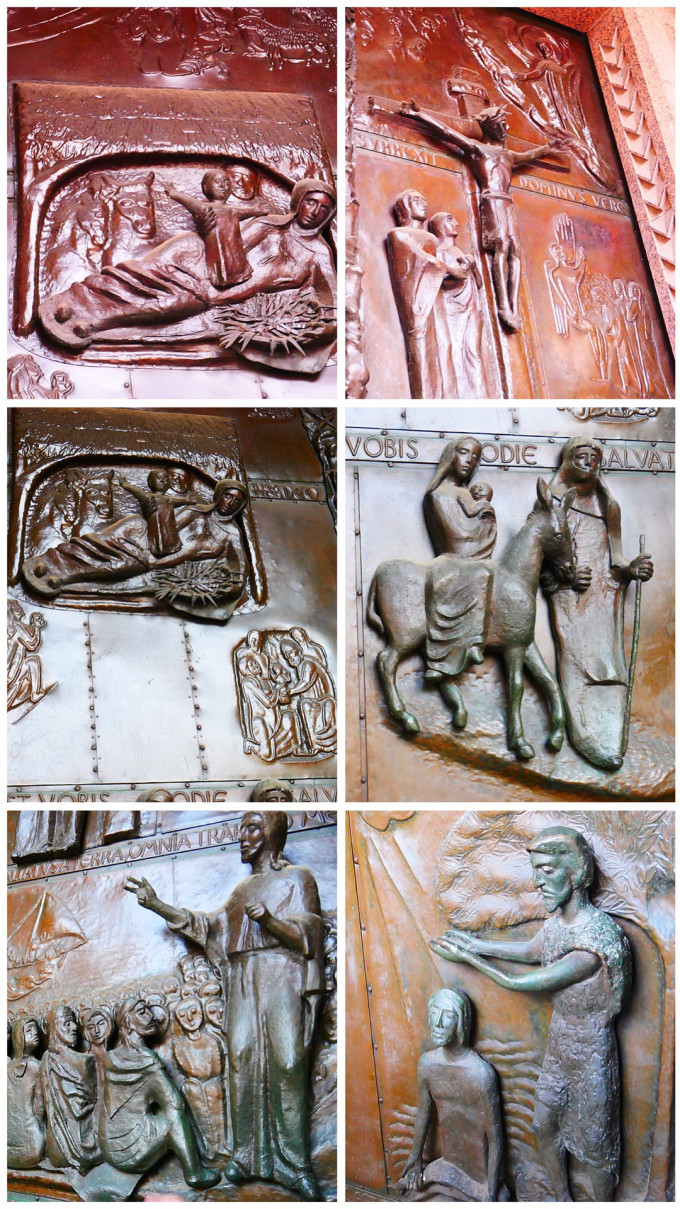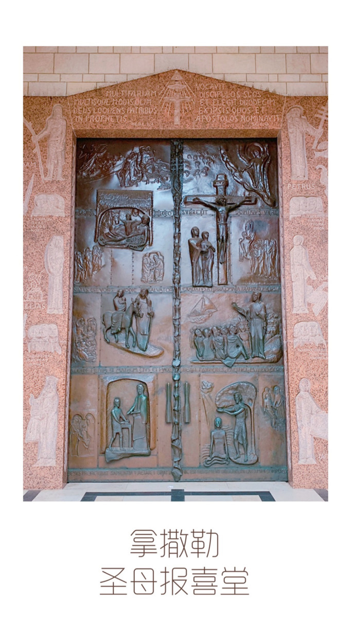 天使报喜堂的正门也是艺术品,这里记录了圣母玛利亚圣灵感孕、身怀六甲时迁往伯利恒申报户口、耶稣在伯利恒出生在马棚、耶稣长大艺、传经布道、耶稣受洗以及最后的耶稣受难直至复活的全过程。大门正上方镌刻着一行拉丁文:“道成了肉身,住在我们中间。”圣经上的这节经文,告诉我们耶稣降世为人,要与人类同在。