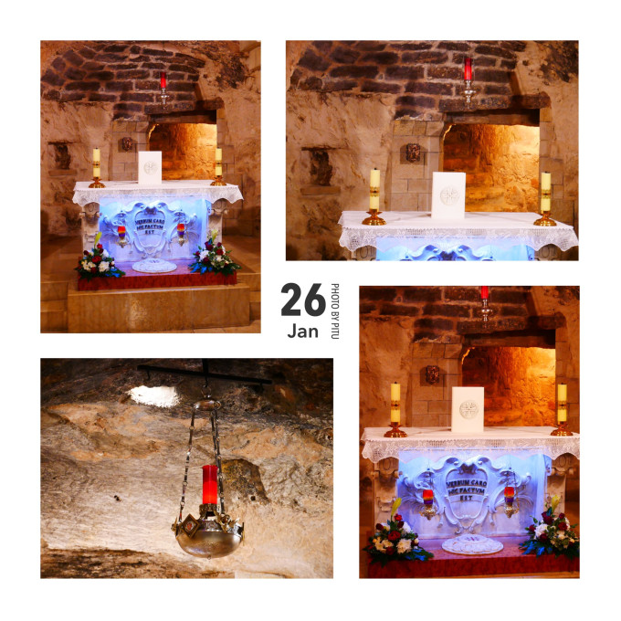 室内保留着天使报喜岩洞,玛利亚在此获得天使传达的信息。教堂室内四壁也陈设着圣母圣子图,较之室外廊下的陈设更为宏大精美。