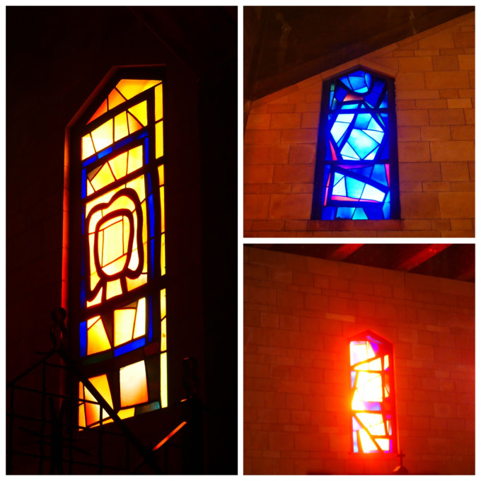 教堂里有许多的彩色玻璃,都是由各种颜色和形状的小块玻璃镶嵌拼接而成。每一块玻璃都不平整,斑驳杂乱,但拼在一起就有种炫目的瑰丽感觉。离近看,当中一些玻璃上还有圣经故事的图案。