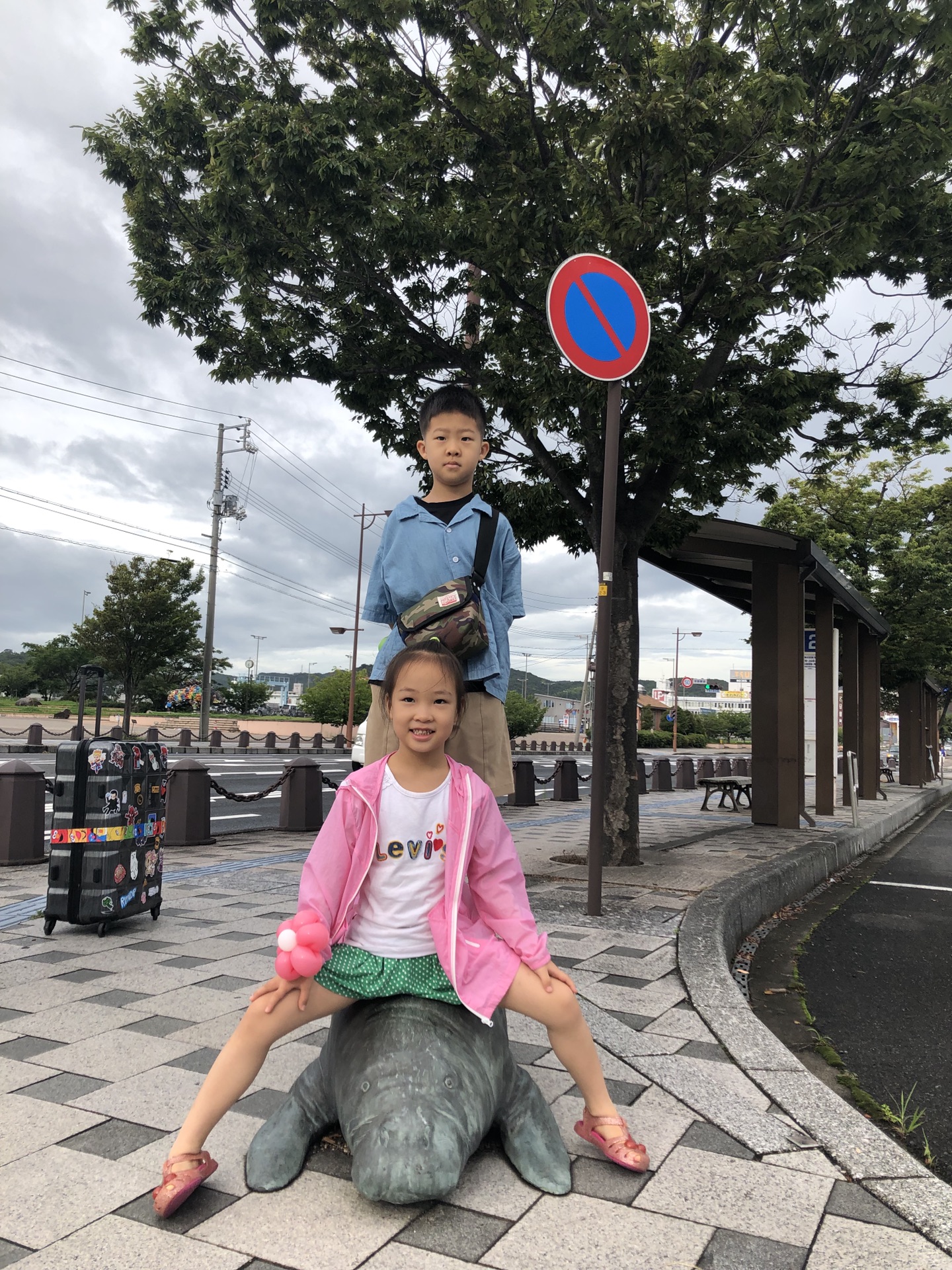而喷泉旁边的桃太郎塑像孩子们却不屑一顾~~~我只能趁着为他们拍喷泉的间隙扭着身子抓紧时间照了这张~~