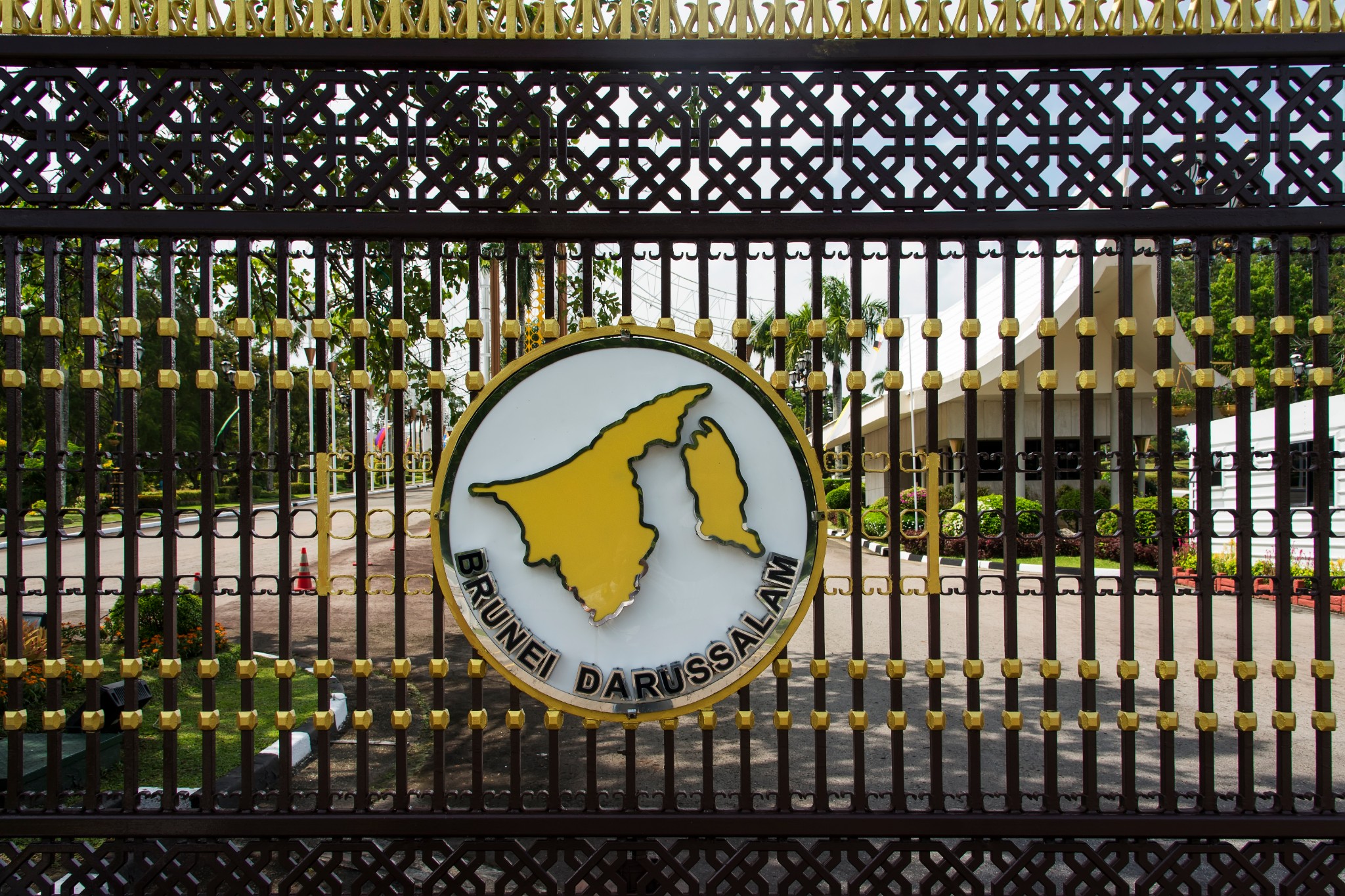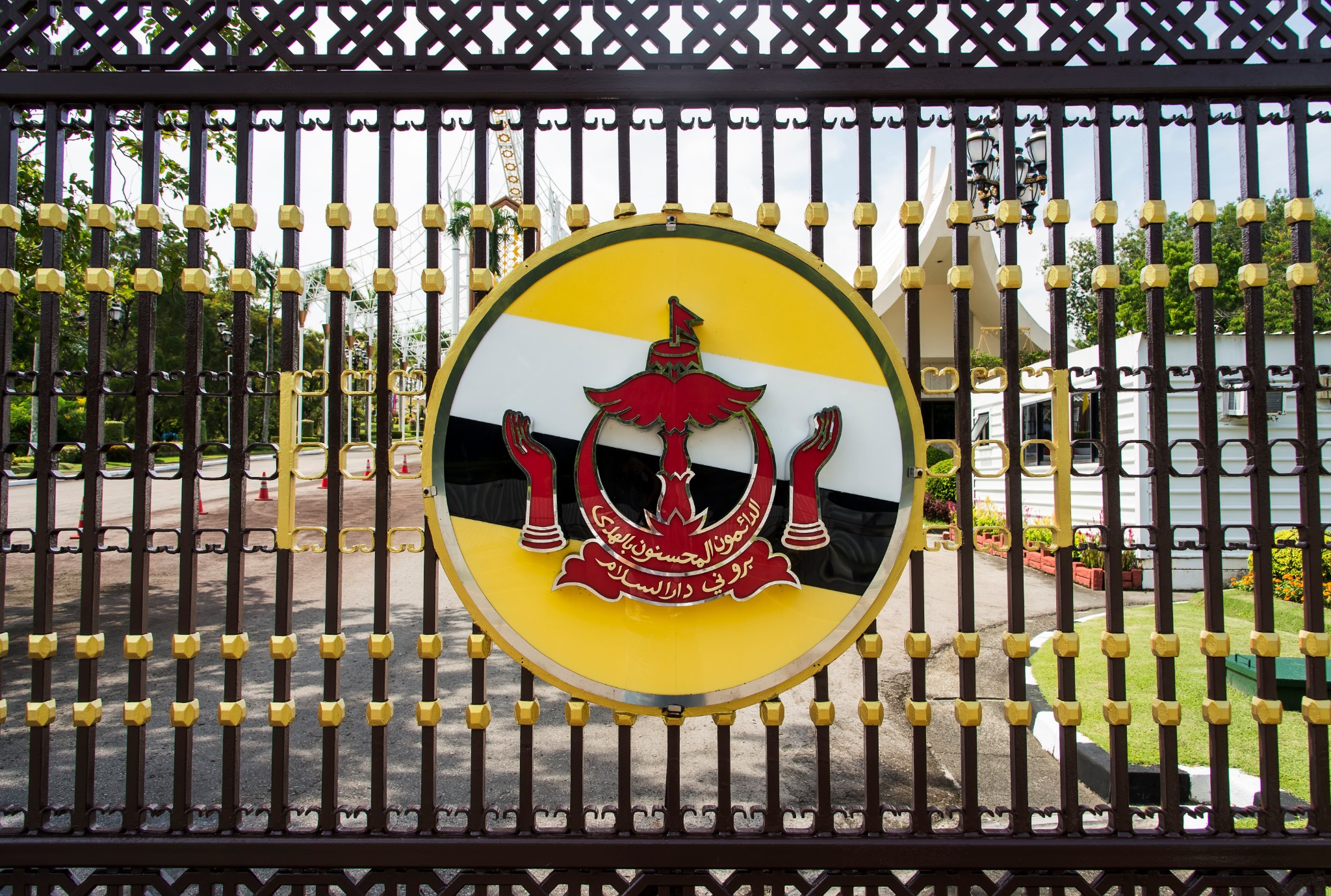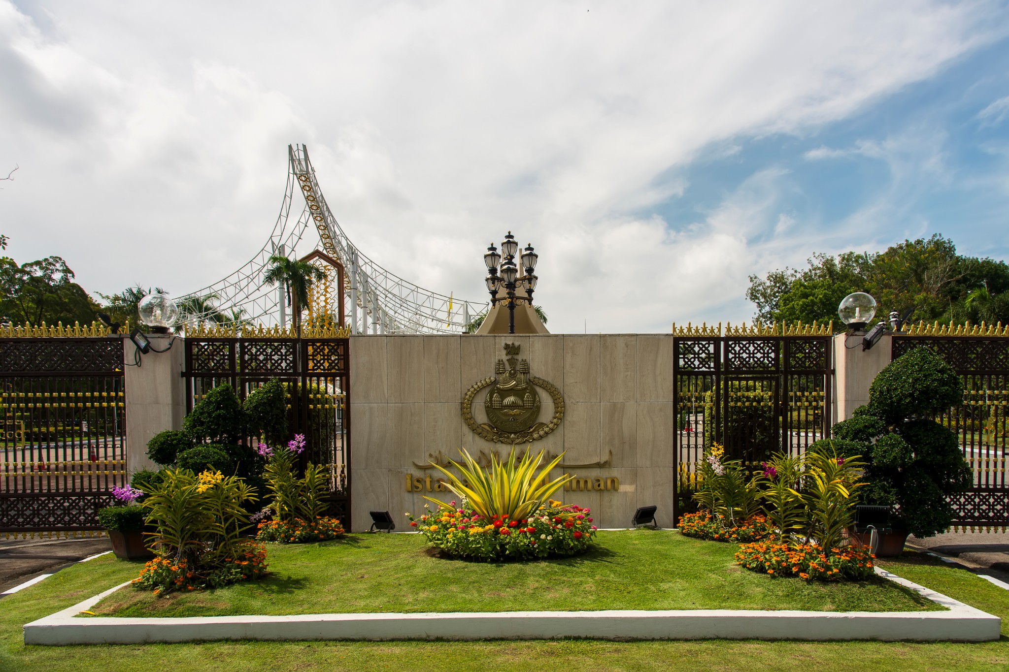 而在水上村可以看见。皇宫的大门紧锁,可以在门口停下拍照。皇宫大门有左右两扇,之间是一堵墙。正中墙上是苏丹的个人徽记,这个徽记在所有和文莱皇家有关的地方都可以看到,包括前面提到的杰米清真寺大门口。徽记最上方的阿拉伯文字代表真主,其下的王冠代表苏丹,再下面是国王的伞盖、代表穆斯林的新月、代表和平的翅膀以及代表富足的麦穗等等。两侧的门上分别是文莱国徽和文莱地图,文莱地图上,可以看见淡布隆县被马来西亚隔开成为了飞地。虽然只是匆匆一瞥,在皇宫门外呆了十分钟,但是也能够一窥文莱皇家的面貌,不能踏入这个皇宫真是一大缺憾。