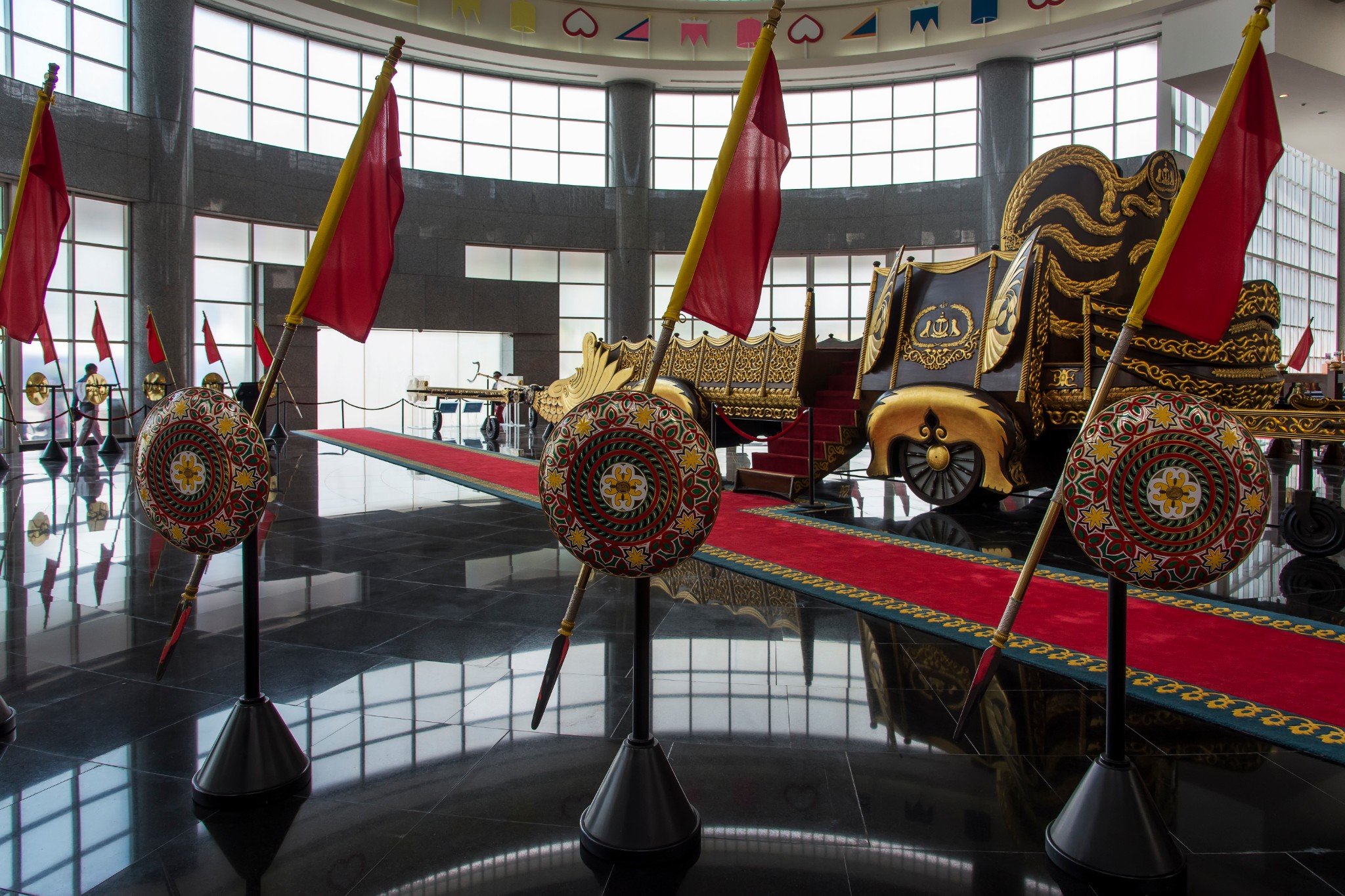 银禧纪念馆,当代苏丹1967年继位,1992年为纪念继位25周年(即为银禧),建造了这个银禧纪念馆。管内陈设着苏丹继位1周年和继位25周年纪念时,在首都巡游使用的两辆巨大车撵,车上包金嵌宝,苏丹的座位铺着虎皮。车撵完全靠人力推动,需要48名侍卫一起努力。加上代表苏丹和大臣名流的各色伞盖、乐手、陪同巡游的名流,整个队伍浩浩荡荡,这些不但可以从陈列中看到,也可以从纪念馆中的当年视频录像中看见。下图就是仪仗和车撵。此外,纪念馆中陈列了文莱苏丹收到的各类礼品,既