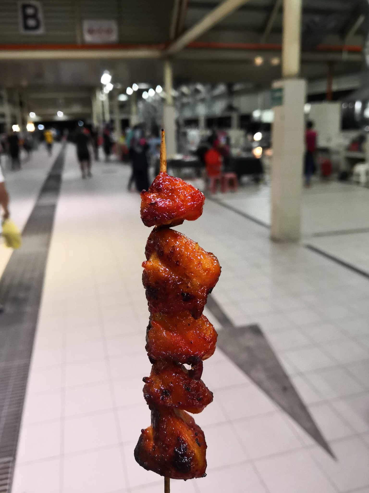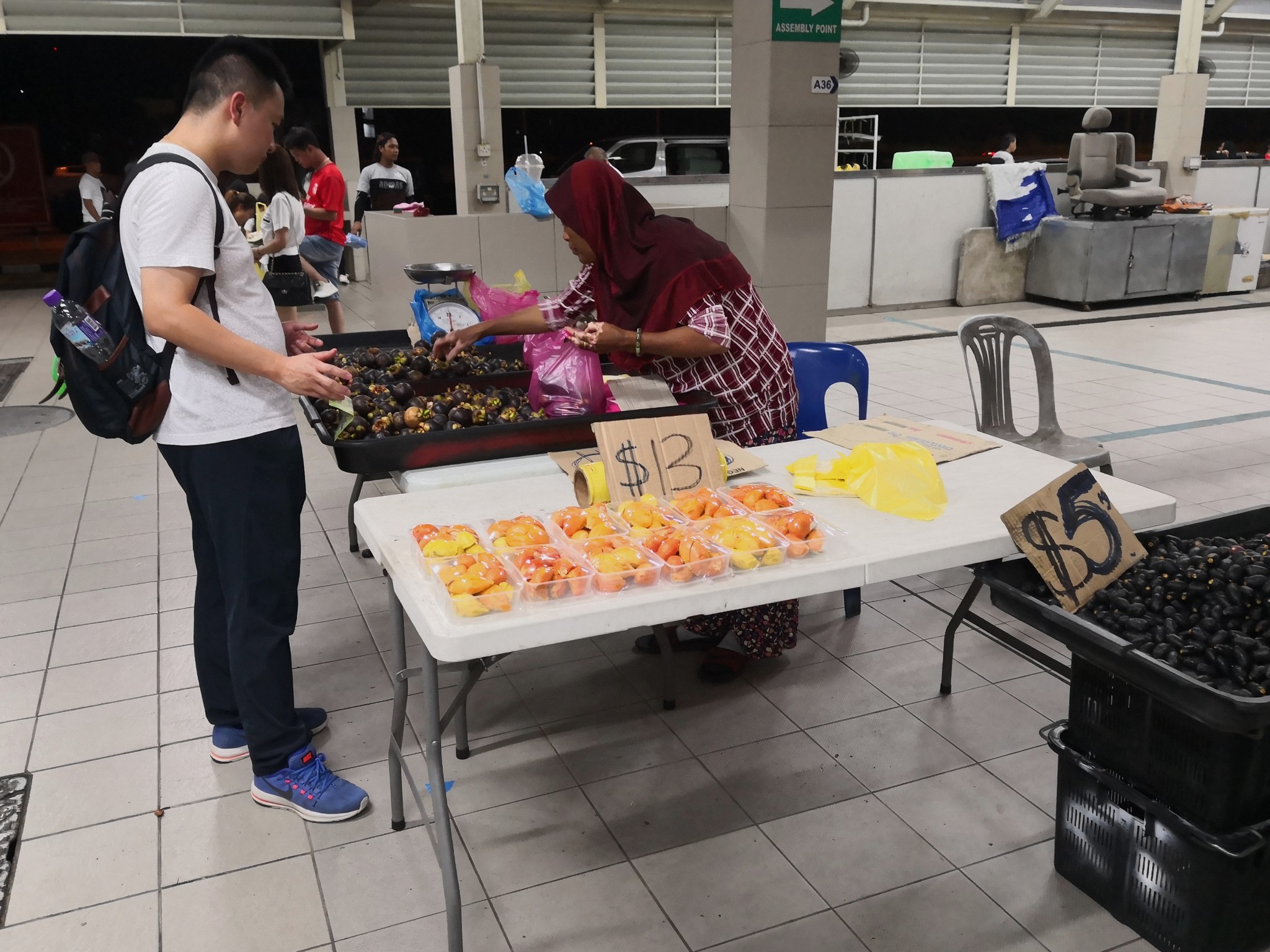 说起去哪里吃,看看大众点评上,最有名的美食点都在帝国酒店。前面提到的麗宫餐厅、zest甜品店、帝国酒店下午茶都在那里,属于享受美食的好地方,不过那里的美食没有民俗气息,称不上文莱特色。品尝文莱小吃,首选必然是加东夜市,这也是文莱最有名的美食摊。说实话,这里就是一个自由市场,每天下午四点后,各种各样的小吃摊和水果摊就各占半壁江山。小吃除了鸡屁股比较特别,其它和上海街头的大排档品种差不多,各种汤粉、烤鱼、烤串琳琅满目。水果的品种不多,但也富于热带特色,对于喜欢吃榴莲的人来说,这里还是不错的。说到底,这里也就是感受一下当地特色,晚上来这里的基本都是游客,而且以中国游客居多,满眼望去如果只看顾客这完全就是一个国内的排挡市场。加东夜市位置很好,就在老城区中心地带,TheMall的背后,从那里步行数百米就可以到达。如果想吃特色