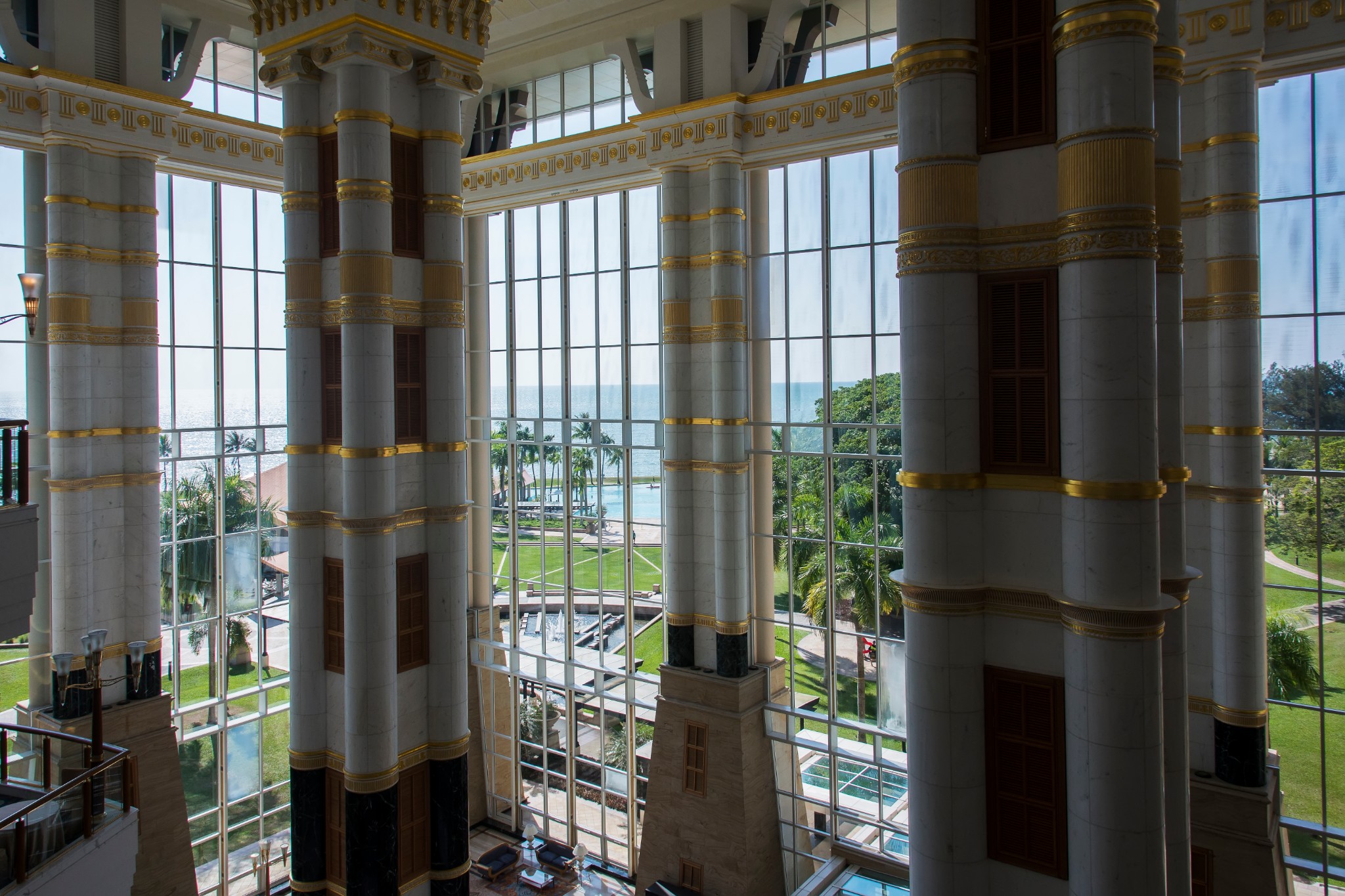 说到住,游客可以选择的宾馆其实也不多,其中最有名的酒店就是帝国酒店。,这座超豪华的酒店原先是专门为王室服务不对外开放,2013年APEC时接待过各国元首入住,如今开始向普通人开放,只是保留了部分王室专门房间。酒店超高的大堂一共有六层,透过超大的玻璃幕墙可以眺望美丽的南海,随处可见镀有纯金的装饰和白色的大理石柱,让人感觉奢华又有艺术感。大堂里可以喝下午茶,55文莱元一位,看着外面的大海,享受惬意的时光,很快就能够让一个下午溜走。此外酒店里的Zest甜品店(看起来就向个旅游商品商店,不像个甜品店)也很有名,我在店里买了好几样糕点,可惜英语不精通,买来的糕点味道完全不是想象中的,有点出人意料。酒店的中餐厅“麗宫”也很有名,不过没有预定的话晚上根本没有位子,所以本想享受一下美食的我,最后被拒之门外了。还有酒店附属的电影院,放映的美国大片电影英语原声,马来语和中文字幕,确保可以无障碍观看,影院的设施也不错,特别是皮质的座椅坐着很舒服。我在影院观看了新上映的新版狮子王,体验了一把当地人的娱乐。当然,以上这些都不是最重要的,帝国酒店最大的卖点,就是这里可以看见南海超级无敌的海上日落景观。酒店的海滩并不大,但沙滩很不错,而且是面向西方一览无余,日落时的景观辉煌灿烂,让人印象深刻。太阳就像一个咸蛋黄,黄中带红,缓缓下沉,把天空都染成了红色。随着太阳渐渐西沉,天空的色彩从明亮的青蓝色,逐渐越来越红,然后又随着太阳落入海中逐渐从红色变为高贵的紫色,继而是越来越深的深蓝,直至最后太阳留下的最后一丝余晖消失,一点点晶莹的星星散落在深蓝的天鹅绒幕布上。所以每到傍晚,海滩上就遍布着看日落或者自拍的游客,直到太阳完全没有影子才会散去。从某种意义上来说,帝国酒店就是文莱必到的一个景点。当然,这么豪华的酒店,住一晚价格也是不菲。不过如果你只是想来这里参观,酒店的工作人员一样欢迎,同样会让你感受到宾至如归的服务。只是酒店距离市区较远(超过10公里),单程20文莱元叫一辆车是必须的,公共交通无法到达那里。