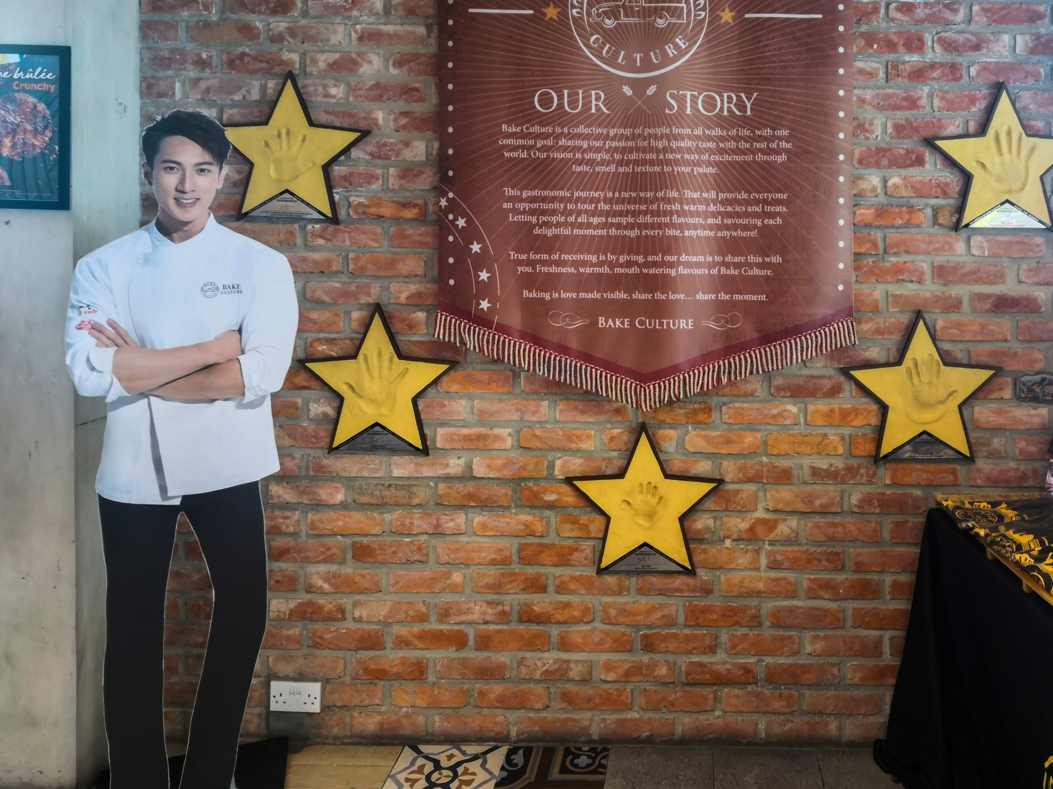 饭,感觉味道也没什么特别,不知道为什么网上这么受推崇。如果说这里有什么优点,首先是价格便宜,和国内同类饭店差不多价格,一餐饭花不了多少钱;其次是营业员会说中文,交流起来十分方便,点菜的时候不用为那些复杂的菜名烦恼;最后就是可以融入当地人的生活,看看普通文莱人是如何就餐的。最后介绍一下吴尊家的面包房BakeCulture,位于杰米清真寺附近,导航也可以定位到,门面很小,容易被错过。这里是粉丝们必到的打卡地,作为景点胜过作为一家面包房。不过不是粉丝你可能会失望。下面这张照片就是店里的标准照,估计来的游客会在吴尊的全身像前拍照留念。他背后的墙上,是小店的创建故事,五个手印是包括吴尊在内的五个合伙人的手印,吴尊的似乎是右边第二个。店里各种小蛋糕,样子还是挺有趣的,不少做成小动物的样子,味道则是普普通通,至少没有惊艳的感觉如果恰好肚子饿了,买几个吃吃也不错,至于价格其实和上海同类糕点差不多。