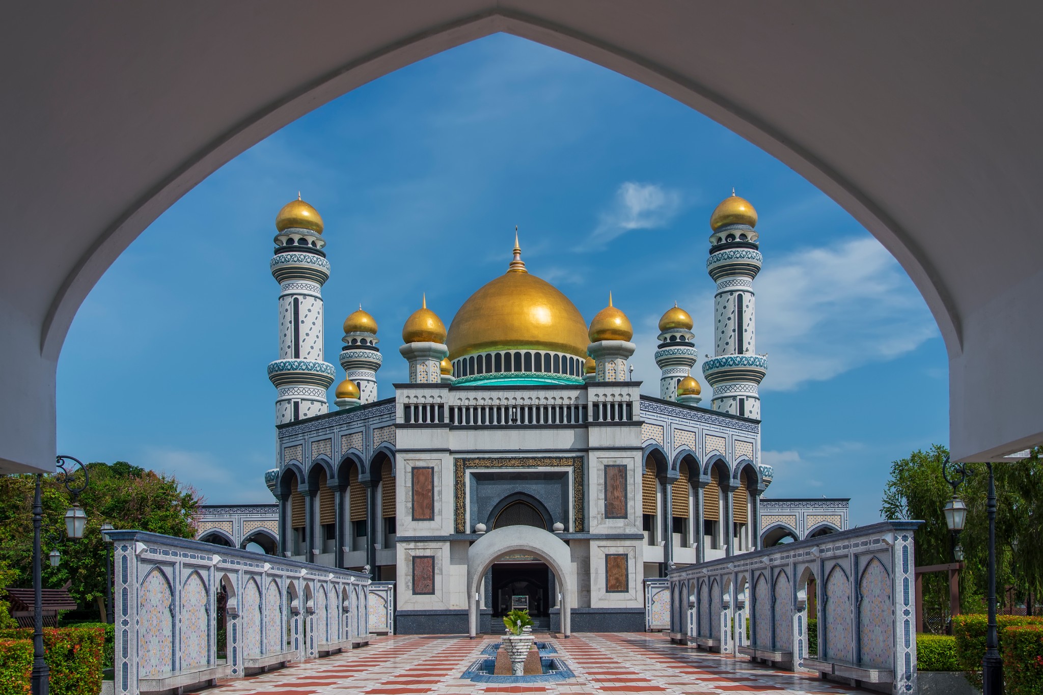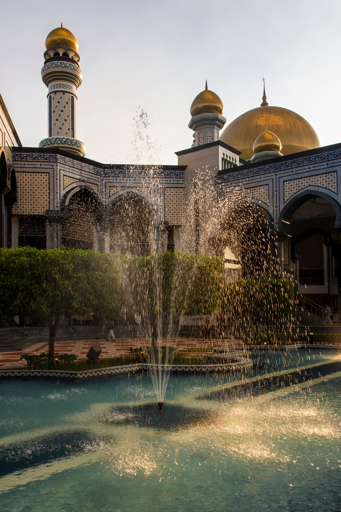 29个金光闪闪的圆顶,象征了苏丹本人是29代苏丹。虽然圆顶不是纯金铸造,但外层也是镀了纯金,价值不可估量,称得上土豪。清真寺分两个主体部分,分别供男性和女性朝拜,还有高耸的宣礼塔矗立在一旁。按照穆斯林的教规,一个虔诚的穆斯林每天应当朝拜5次,可以在任何地方但能够去清真寺最好,每周五是朝拜日,文莱全国定为休息日,方便人民进行宗教活动,所以文莱的双休日是每周五和周日。杰米清真寺虽然是皇家清真寺,但也供所有教徒朝拜使用,同时也可以参观,但是周四和周五不对外开放,只有教徒可以朝拜,这也是文莱所有清真寺的规矩。在我看来,文莱众多清真寺中,杰米清真寺是最适合拍照的,无论其外观、内饰、周围大量的穆斯林风格的建筑和喷水池,让这座清真寺变得光彩夺目。上面的图片就是清真寺的标准照,从女性换鞋处拍摄的女性朝拜大厅,拱廊的弧度和圆顶的弧度完美结合,金色的圆顶又与蓝天相映,愈发美丽。但是这里的清晨和黄昏更加美丽,文莱清澈的天空