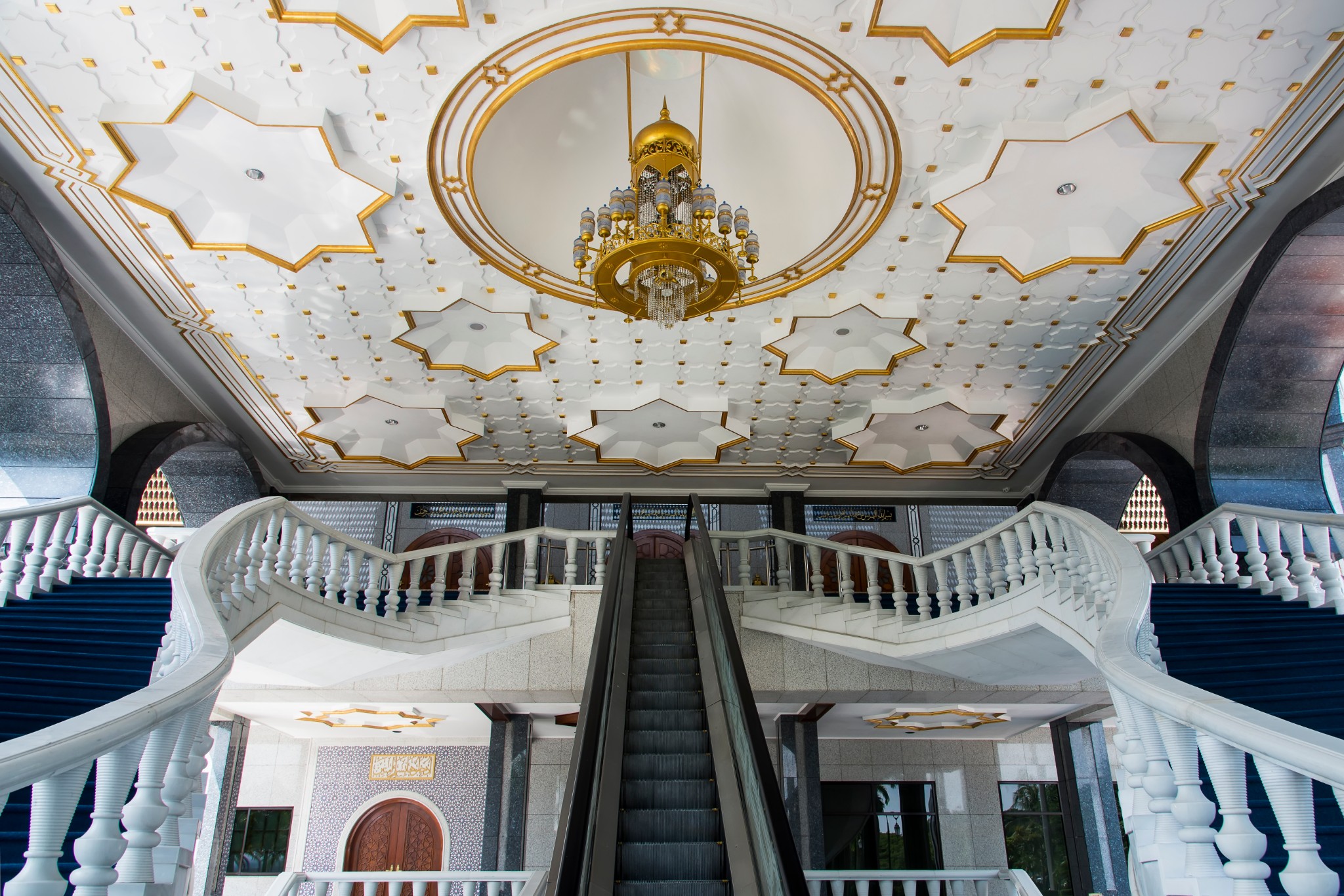 动扶梯皇室专用,一般人享受不到了。顶上的吊顶灯是从欧洲进口的,大大小小一共也是29个,其中最大的那个就在朝拜大厅中,重达2吨多,而那个大厅气势宏大,能够容纳数千人朝拜,可惜朝拜大厅内不能拍照。