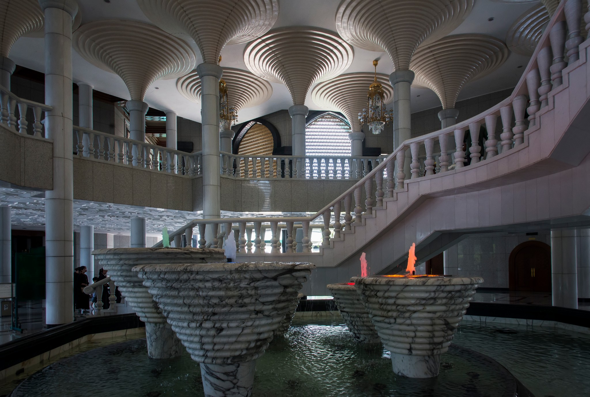 让每天的日出日落都是这样辉煌,清真寺的金顶、喷泉都会因为这辉煌的阳光更加炫彩夺目。清真寺的很多细节处也很适合拍摄人像,比如室内大厅、独具特色的伊斯兰花纹装饰的大门、男性朝拜厅正门外造型优美的大理石楼梯、清真寺正门一路到主体建筑之间一长溜喷水池、高大的棕榈树和造型独特的路灯,这些细节之美都等着每一个参观者发掘。顺便说一句,下图就是男性朝拜厅门外的情景,中间的自